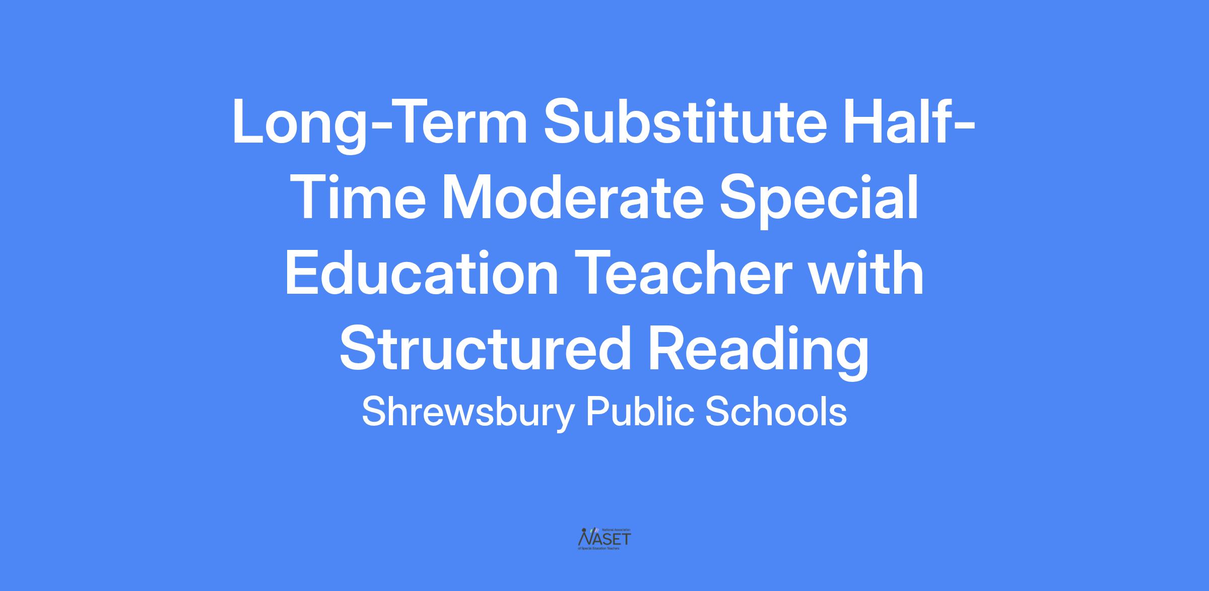 Shrewsbury Public Schools is currently accepting applications for a Long-Term Substitute Half-Time Moderate Special Education Teacher with certification in Wilson or Orton-Gillingham or both. This position is ideal for someone who can assess what reading interventions are needed and then provide the services. This position would begin as soon as possible and will last through the end of the school year, currently June 12, 2026.