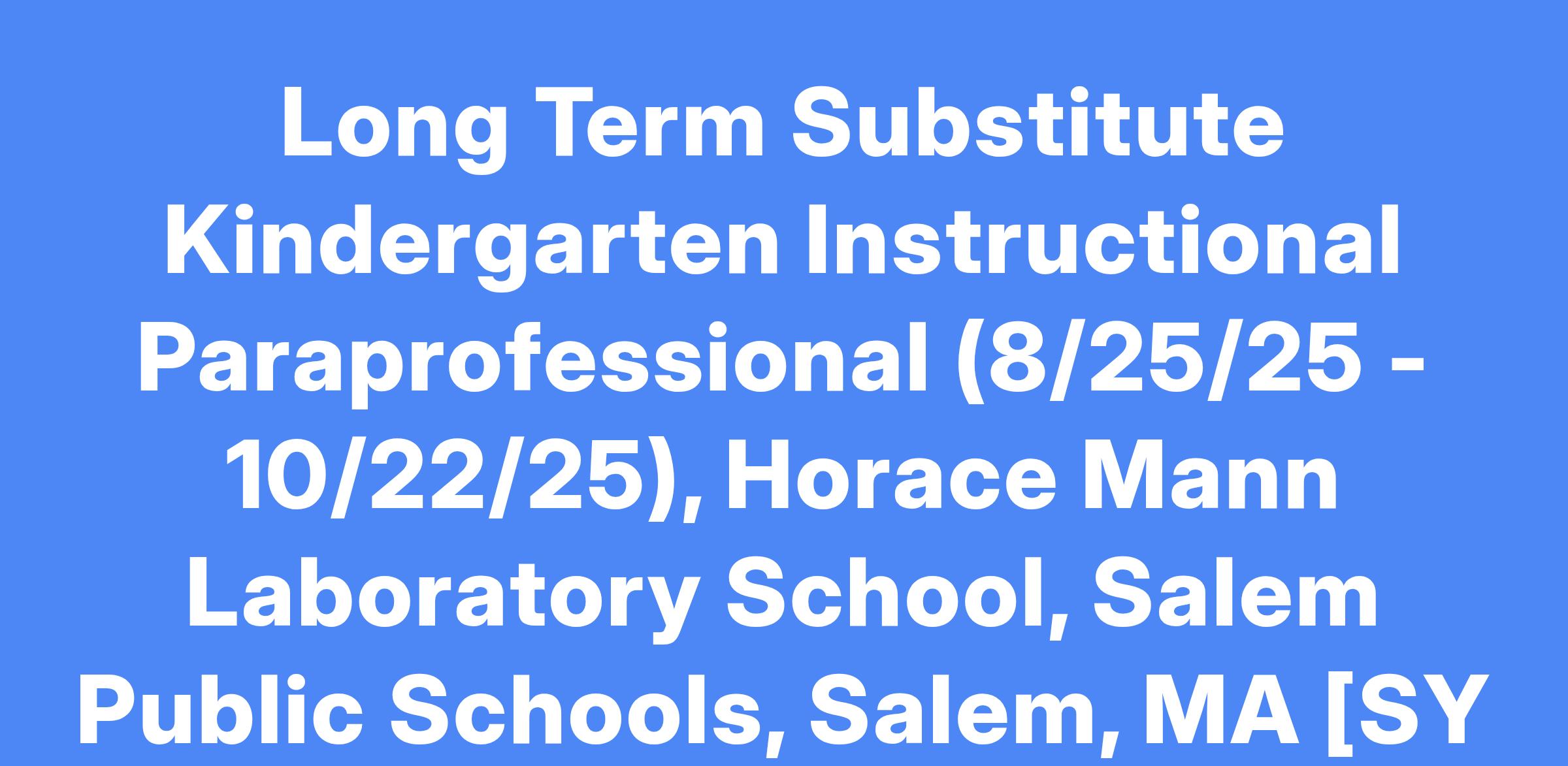Long Term Substitute Kindergarten Instructional Paraprofessional (8/25/25 - 10/22/25), Horace Mann Laboratory School, Salem Public Schools, Salem, MA [SY 2025-2026]