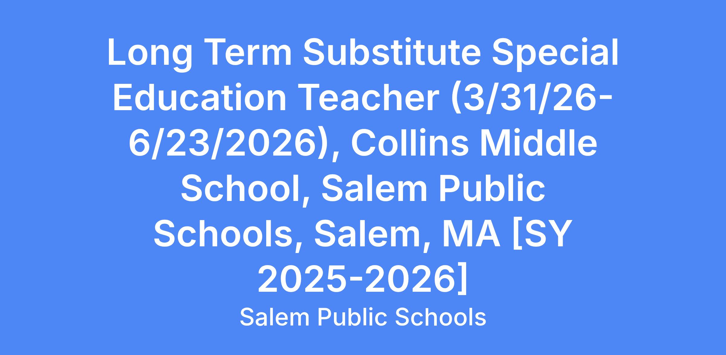 Long Term Substitute Special Education Teacher (3/31/26-6/23/26), Collins Middle School, Salem Public Schools, Salem, MA [SY 2025-2026]