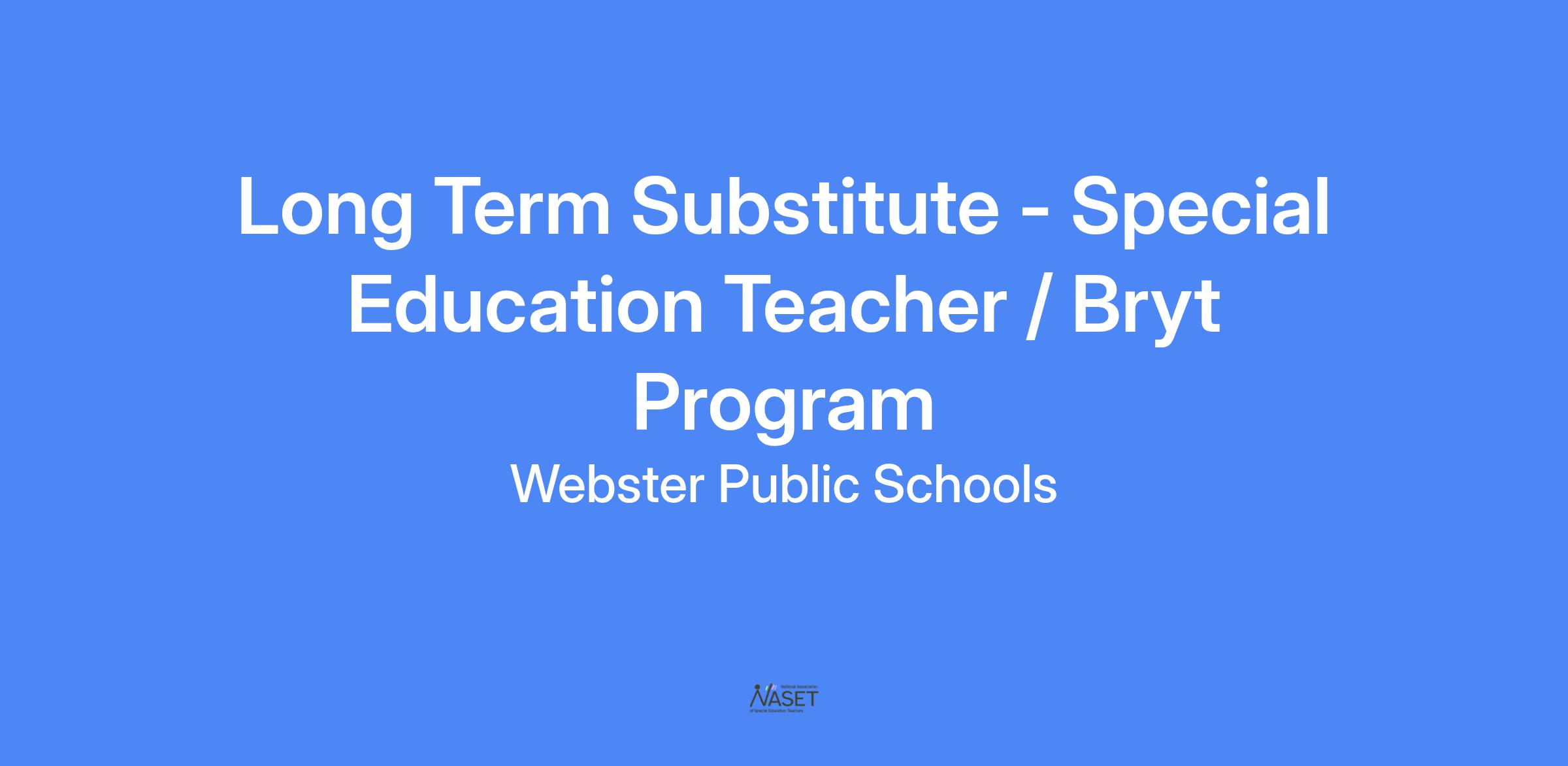 Webster Public Schools is seeking a qualified Long Term Substitute Special Education Teacher / for the position of Bryt Program at Webster Middle School. This Long Term position will be from 8/25/25 to 06/17/26