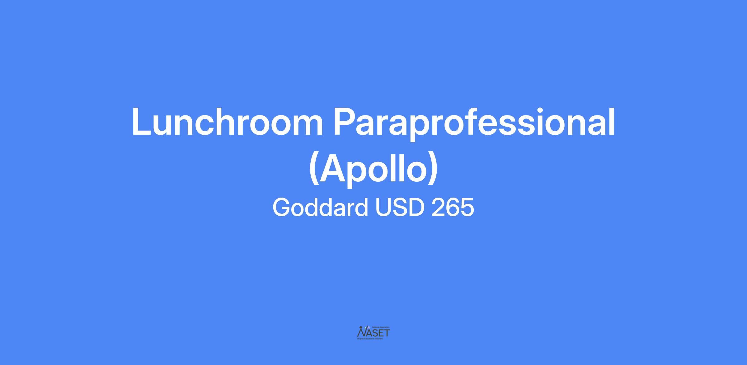 Lunchroom Paraprofessional (9 months, 15 hours per week): Apollo Elementary School has an opening for a lunchroom paraprofessional to work approximately 3 hours per day, 10:45 a.m. – 1:45p.m. The lunchroom paraprofessional will provide student supervision in the cafeteria. Interested applicants will need to complete an on-line application at https://www.applitrack.com/goddardusd/onlineapp/. Please direct all questions to Connor Christensen, Principal at Apollo Elementary School, at cchristensen@goddardusd.com. The position will remain open until filled.
