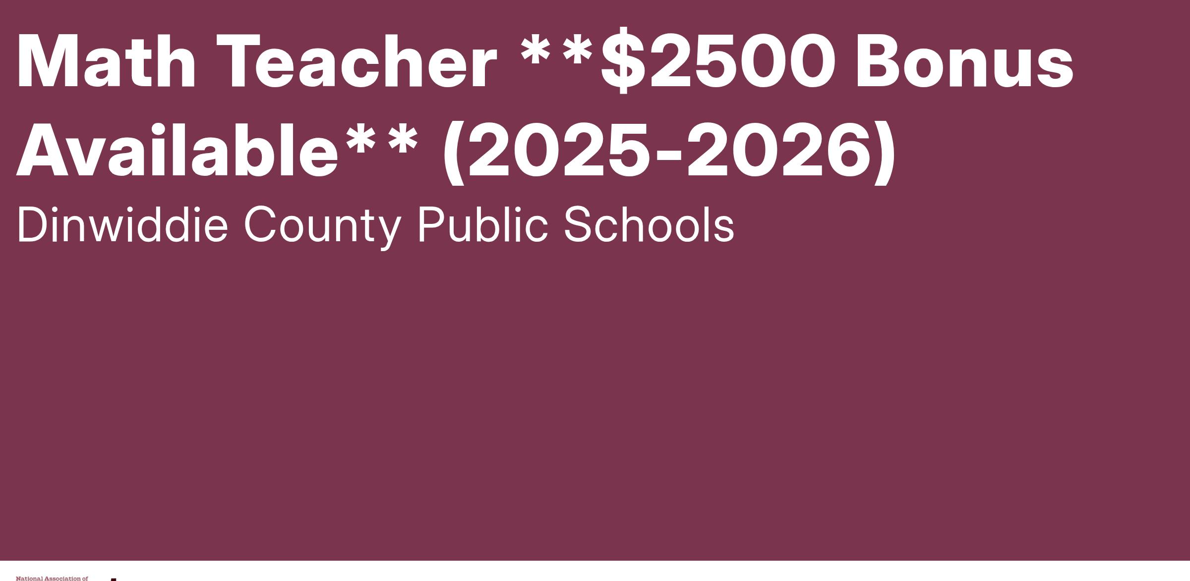 As an Equal Opportunity Employer, Dinwiddie County Public Schools does not discriminate against applicants on the basis of race, color, religion, national origin, ancestry, political affiliation, sex, sexual orientation, gender, gender identity, age, marital status, genetic information, disability or protected veteran status.