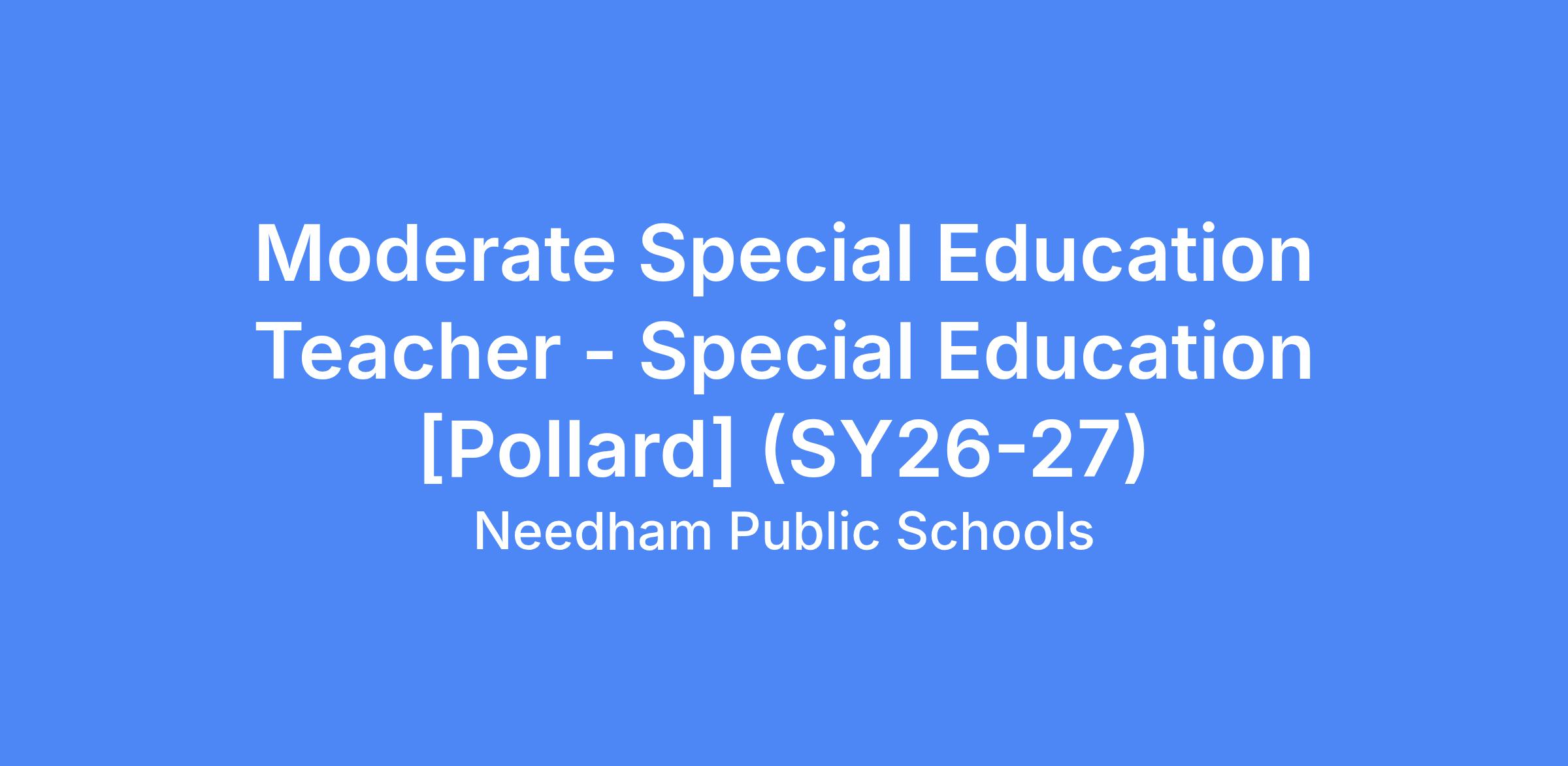 The Needham Public Schools is seeking a Special Education Teacher of diverse backgrounds and experiences. Under the general supervision of the Special Education Coordinator and School Principal, to maximize the learning experience of students with special needs, in academics, interpersonal skills, and activities of daily living by implementing district-approved curriculum; documenting teaching and student progress/activities, outcomes; addressing students' specific needs; and providing a safe and optimal learning environment.