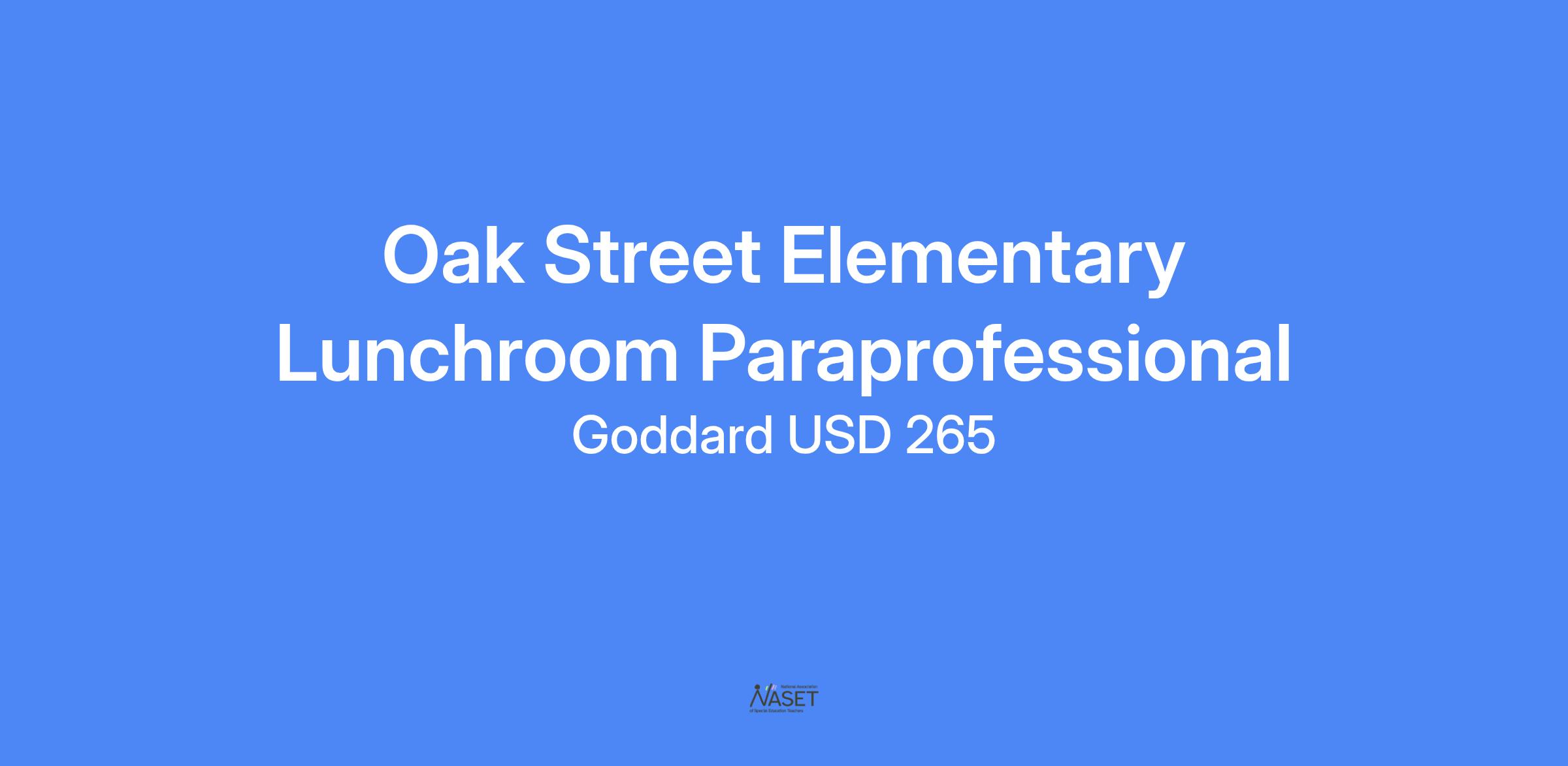 Lunchroom Paraprofessional (10 month position, 15-17 hour work week): Oak Street Elementary School has an opening for a part time (approximately 3hours/day) lunchroom paraprofessional. Applicants must be available to work between the hours of 10:30 a.m. and 1:30 p.m. Internal applicants should submit a letter of interest to Mrs. Ashley Miller, Principal. External applicants will need to complete an online application. Please direct all questions regarding this position to Mrs. Ashley Miller, Principal of Oak Street Elementary, at 316-794-4200 or amiller@goddardusd.com Position open until filled.