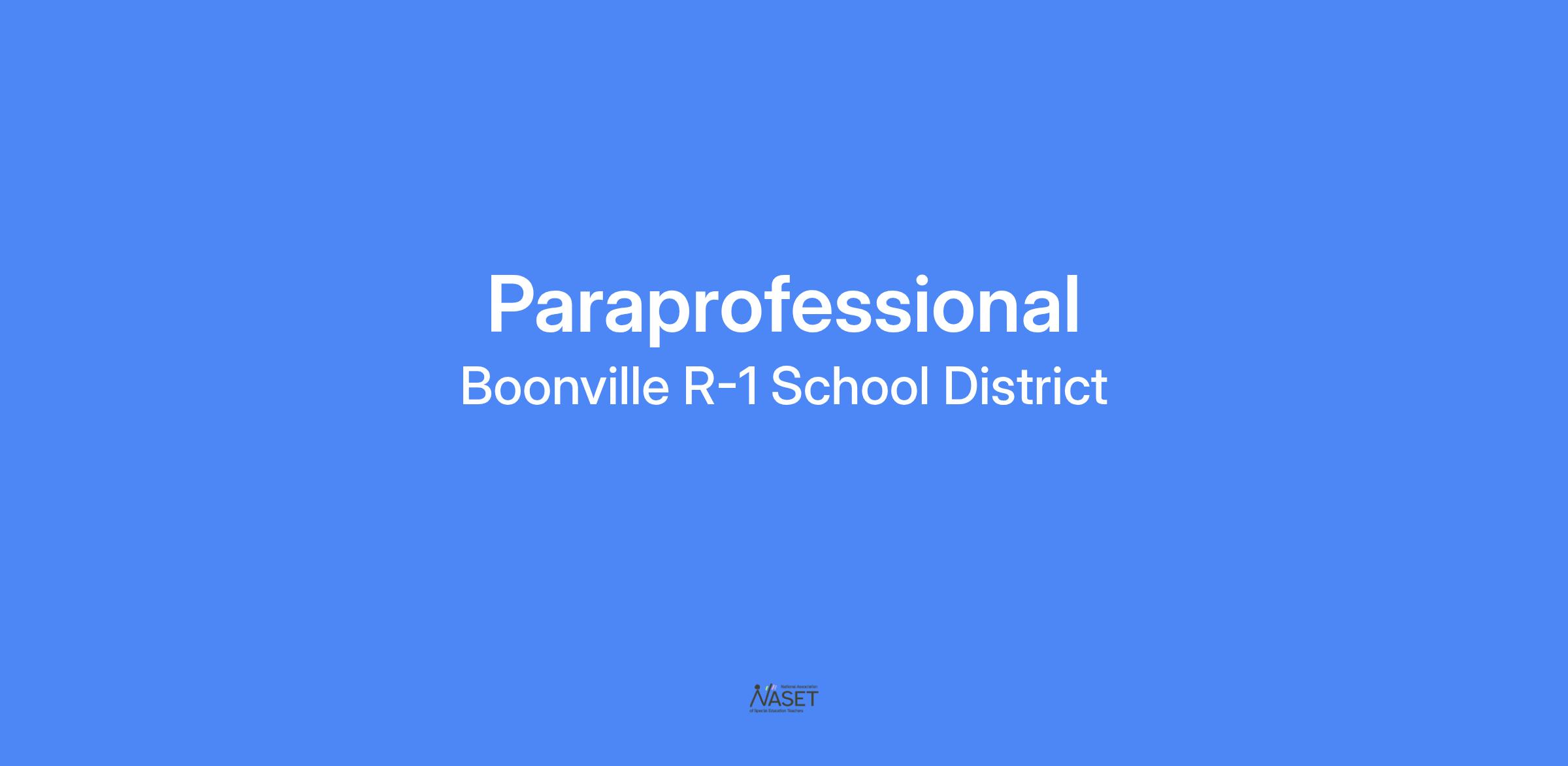 The Boonville School District has an immediate opening for an elementary Paraprofessional. This is a 9-month position with full benefits. Qualified applicants will have 60 college credit hours OR be willing to take and pass the ETS ParaPro assessment OR be willing to obtain a substitute certificate in accordance with the Department of Elementary and Secondary Education. Interested applicants may begin the application process by clicking the "Apply for this position" button on this page or by visiting www.bpsk12.net Position open until filled. Boonville R-I School District is an Equal Opportunity Employer.