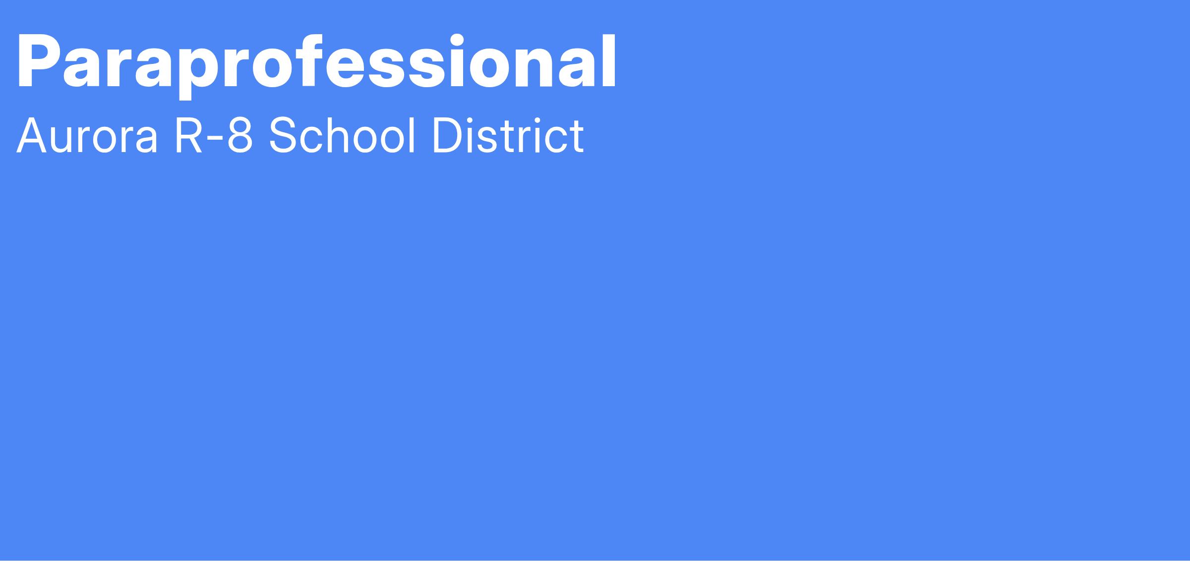 Come join our team, we have a four day work week and a staff daycare. Aurora R-8 is seeking a paraprofessional to work in a behavior support classroom and with individual students at the early childhood elementary level for this school year. The purpose of our behavior support classroom is to provide students with the opportunity to regulate and learn behavior skills to support them in life. The applicant must have 60 college hours or have passed the Para Praxis Pro. A college degree or someone working towards a teaching degree is preferred. They must also be willing to help with personal hygiene tasks, be able to lift/position a student, and help with personal tasks as well as assist with academics. The person must be able to document well and be able to work with a variety of people.