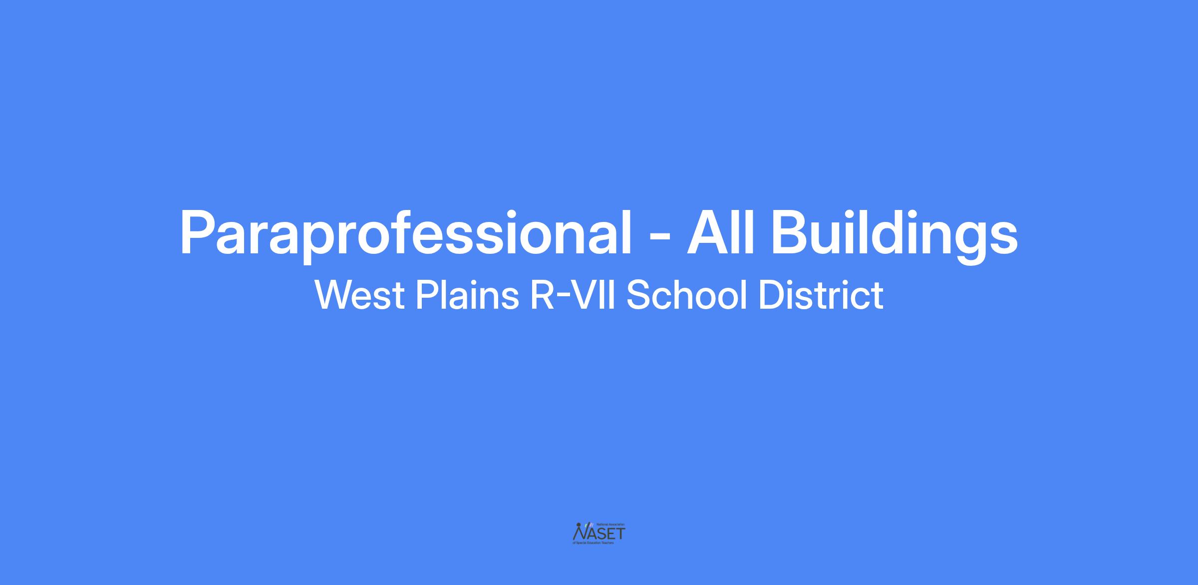 The West Plains School District is currently accepting applications for the position of paraprofessional for the current and upcoming school year. A paraprofessional is responsible for assisting students individually and/or in small groups as well as assisting classroom teachers with class activities. A complete list of responsiblities as well as qualifications are listed below for review. This position is considered open until all positions are filled.