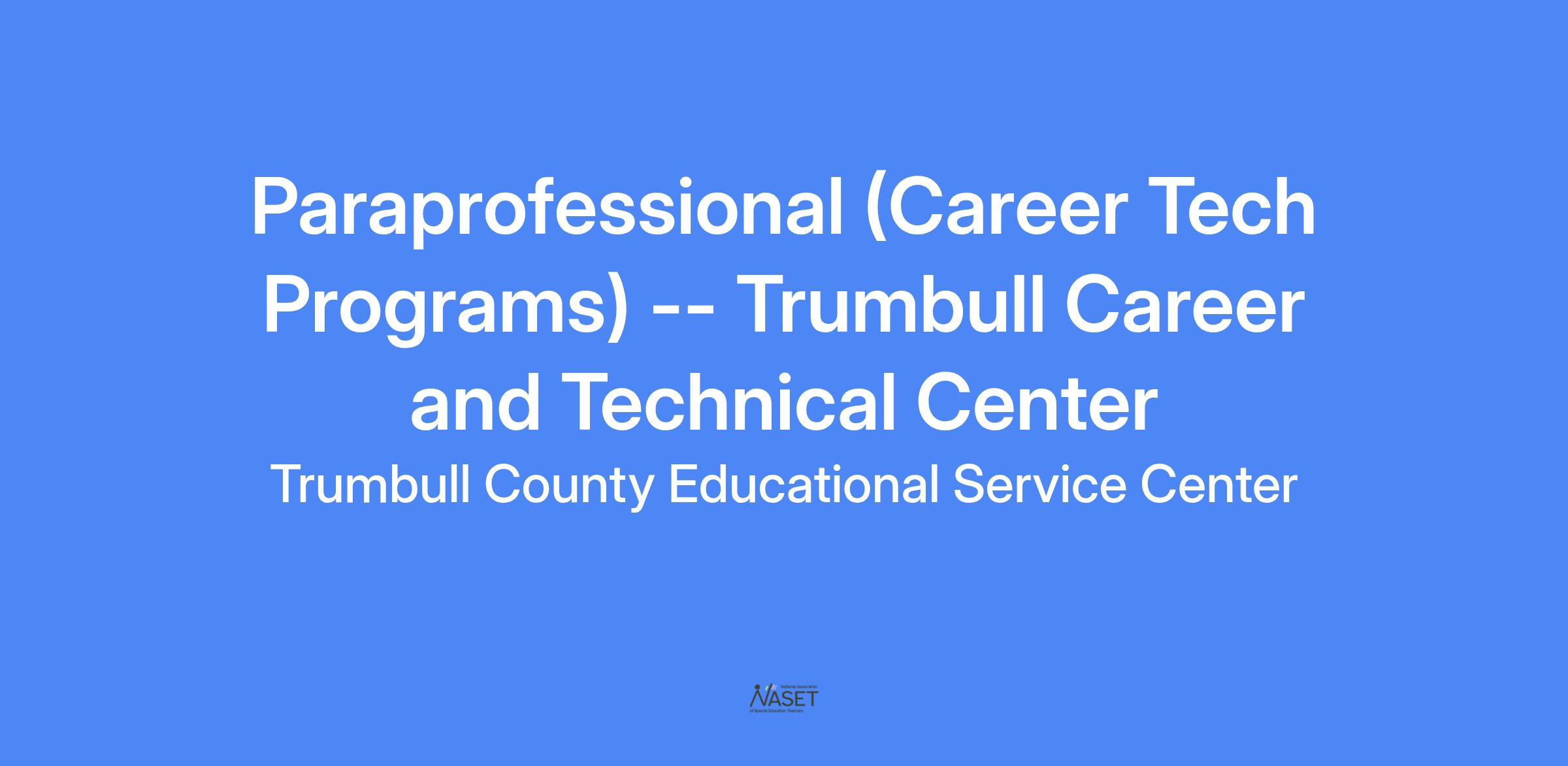 PARAPROFESSIONAL (Career Tech Programs): - The Trumbull Career & Technical Center is seeking a dedicated Paraprofessional / Educational Aide to support students in our career tech labs. This position is ideal for someone who enjoys working directly with students and has a passion for technical skills and shop environments. The successful candidate will assist students with tasks, ensure a safe and productive learning environment, and provide general support within CTE programs.