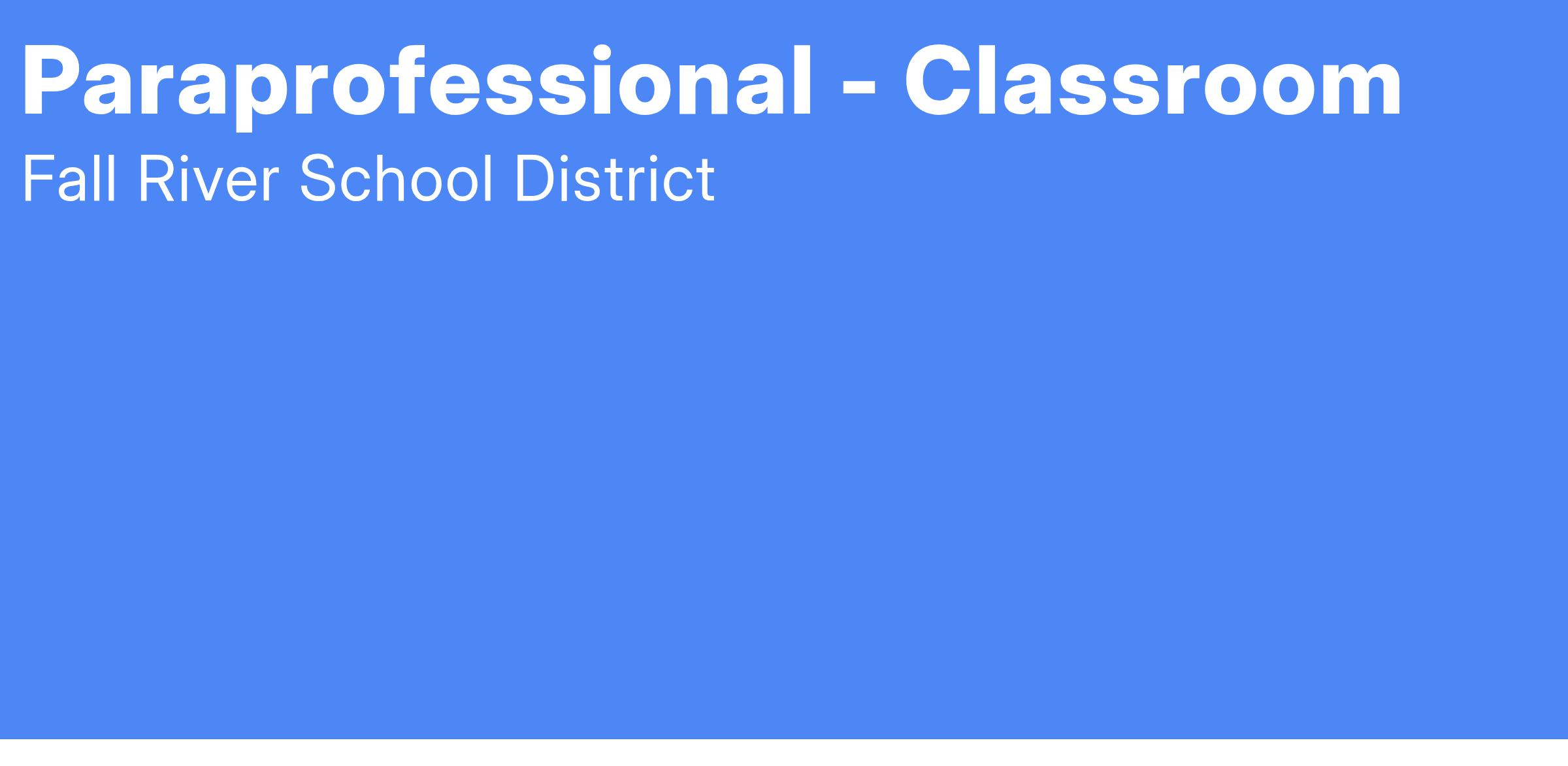 SALARY AND TERMS OF EMPLOYMENT: In accordance with the Fall River Paraprofessionals contract. Employment is contingent upon job performance, program needs, and funding. Salary includes a 183 day work year, with 210 paid days per year (including vacation and paid holidays).