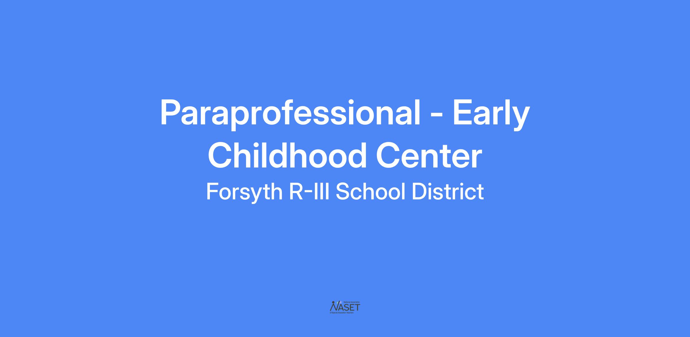 The Forsyth R-III School District is accepting applications for a paraprofessional in our 2's and 3's program in our new Early Childhood Center beginning in January 2026. Applicants at a minimum should possess a valid Missouri substitute certificate. Primary responsibilities will be to supervise and help two and three year old students develop social and emotional skills, gain essential readiness skills, collaborate with colleagues to meet the needs of the students, and other duties as assigned. Work days will follow the Forsyth School District calendar.