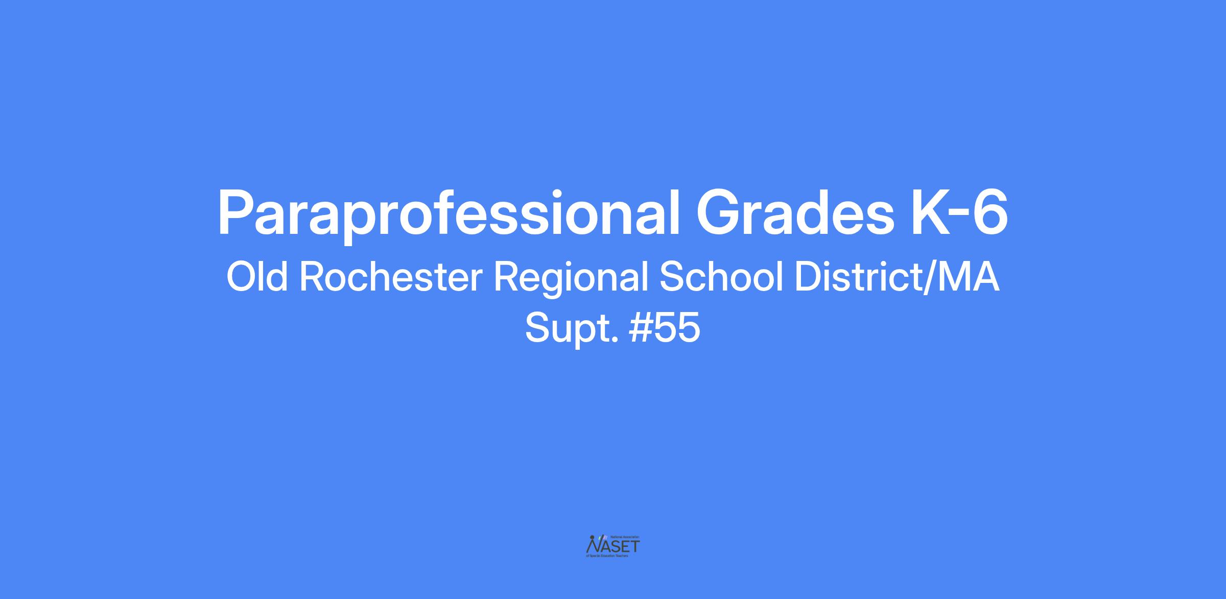 Old Rochester Regional School District/ MA Superintendency Union #55 is currently seeking a paraprofessional at Rochester Elementary School for grades K -6.