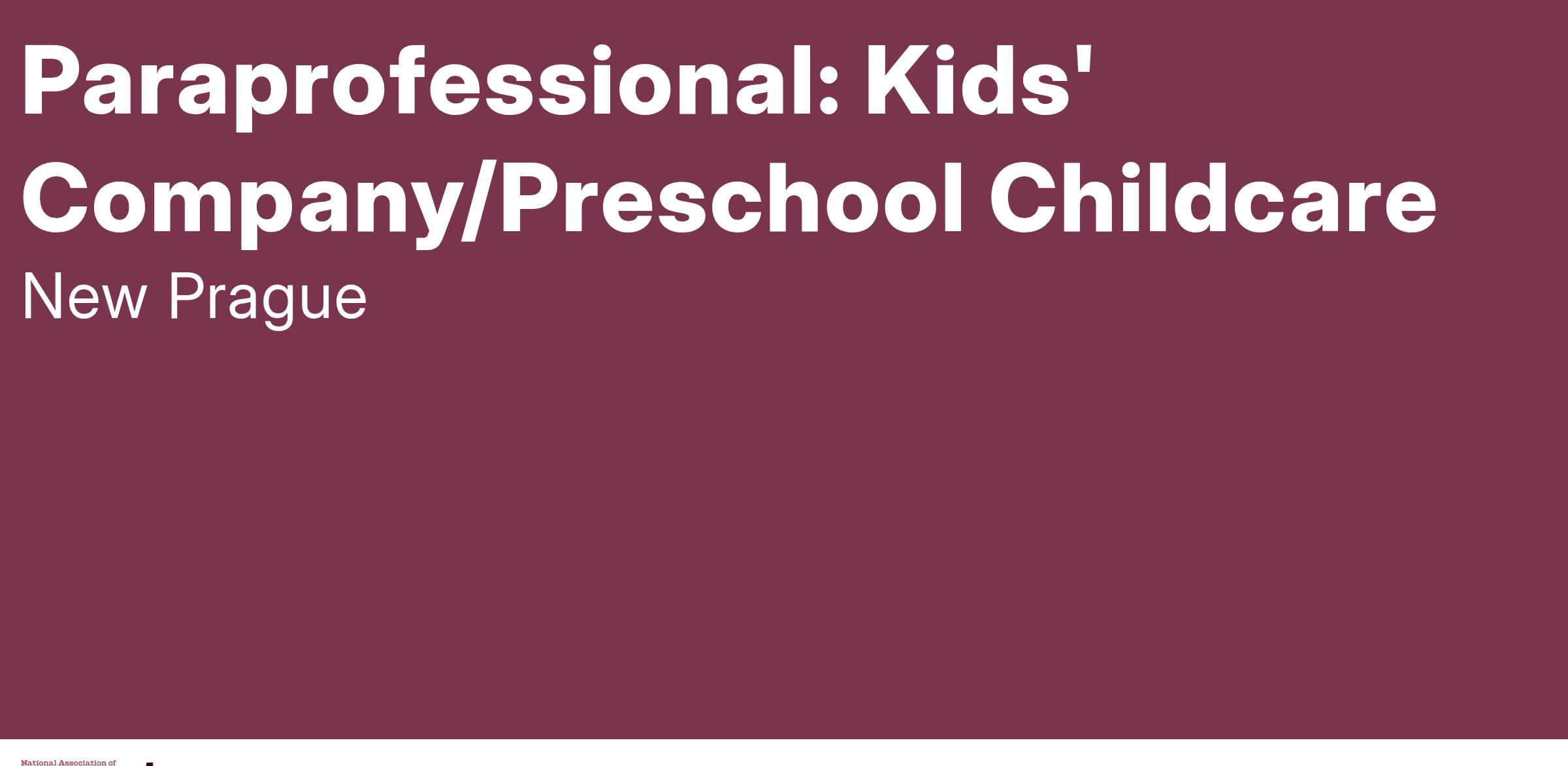 JOB SUMMARY: A Paraprofessional with the Kids' Company program supports the program's daily operations by fostering a safe, structured, and engaging environment for enrolled children. Key responsibilities include supervising and interacting with children, facilitating choice-based activities, and monitoring interactions to encourage positive behaviors. This role also provides targeted support to students' social and emotional development, offering assistance to children who may need additional guidance. Strong interpersonal skills, patience, and a commitment to nurturing each child's growth are essential for success in this position.