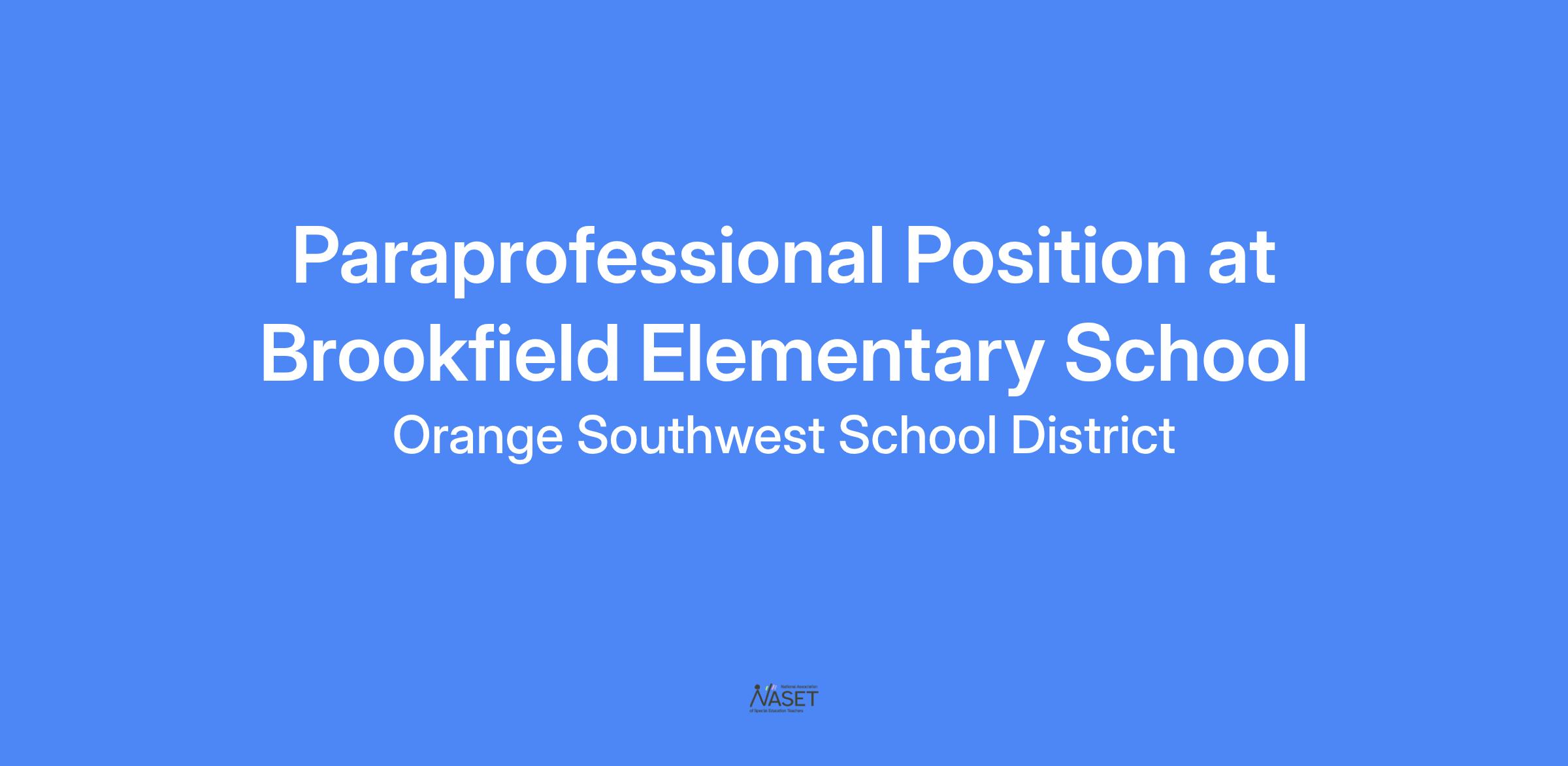 Brookfield Elementary School is in search of a paraprofessional for this school year. Candidates should have experience working with children, demonstrate flexibility, patience, compassion, positivity and have good communication skills. The primary function of this position is to support a child with special needs to access their education and facilitate peer interactions. Training is available for this position. Hourly wage range is between $19.52 to $20.55 with up to an additional $1/hr based on completed college credits. Come work at our wonderful school with our fantastic students and staff!