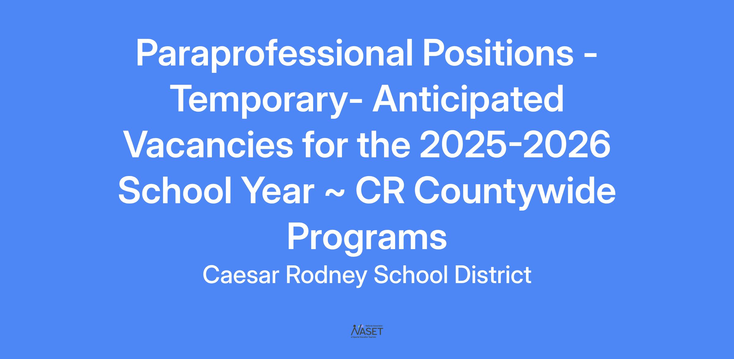 The Caesar Rodney Countywide Programs is currently seeking Temporary Paraprofessionals for the 2025-2026 school year to fulfill various needs in buildings based on student enrollment, IEP's, programming and instruction. Positions may include Instructional Paraprofessional, 1:1 Support Paraprofessional, or other specific assignments, as detailed by administration, to support student achievement and well-being. All positions are full-time.