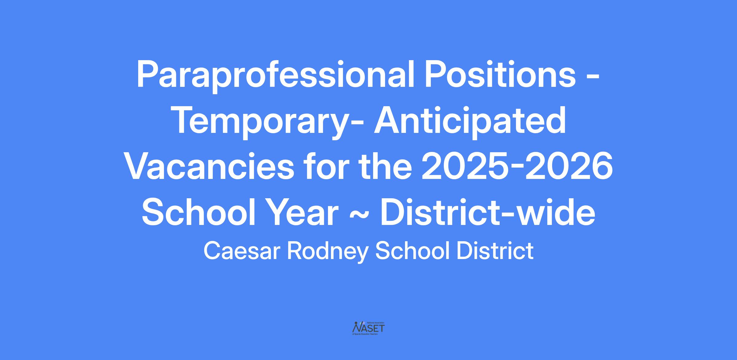 The Caesar Rodney School District is currently seeking Temporary Paraprofessionals for the 2025-2026 school year to fulfill various needs in buildings based on student enrollment, IEP's, programming and instruction. Positions may include Instructional Paraprofessional, 1:1 Support Paraprofessional, or other specific assignments, as detailed by administration, to support student achievement and well-being. All positions are full-time.