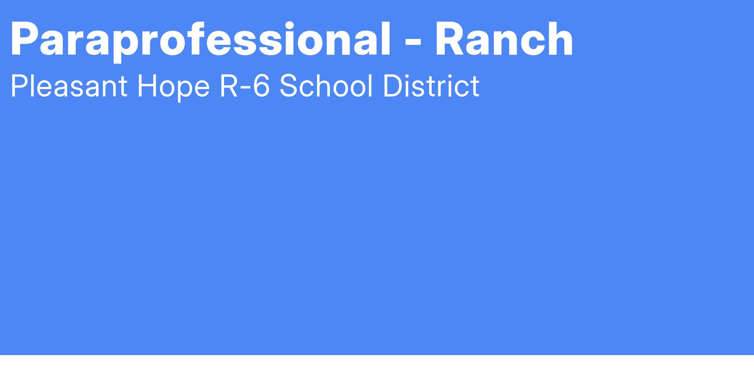 The Pleasant Hope R-VI School District is currently accepting applications for a full-time paraprofessional at The Ranch School for the 2025-2026 school year. Pleasant Hope offers a 4-day school week (Tuesday-Friday), competitive salary, full health benefits, and a family-like working atmosphere. Substitute certification, fingerprint and satisfactory background check required.
