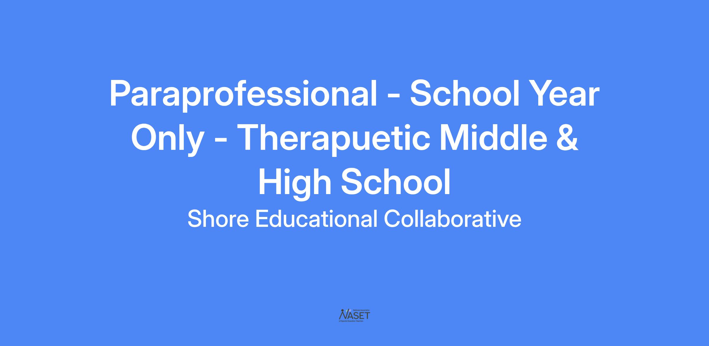 Shore Educational Collaborative has an immediate opening for a school year Paraprofessional position in our therapuetic middle & high school. Excellent benefits, paid time off, and competitive wages provided.