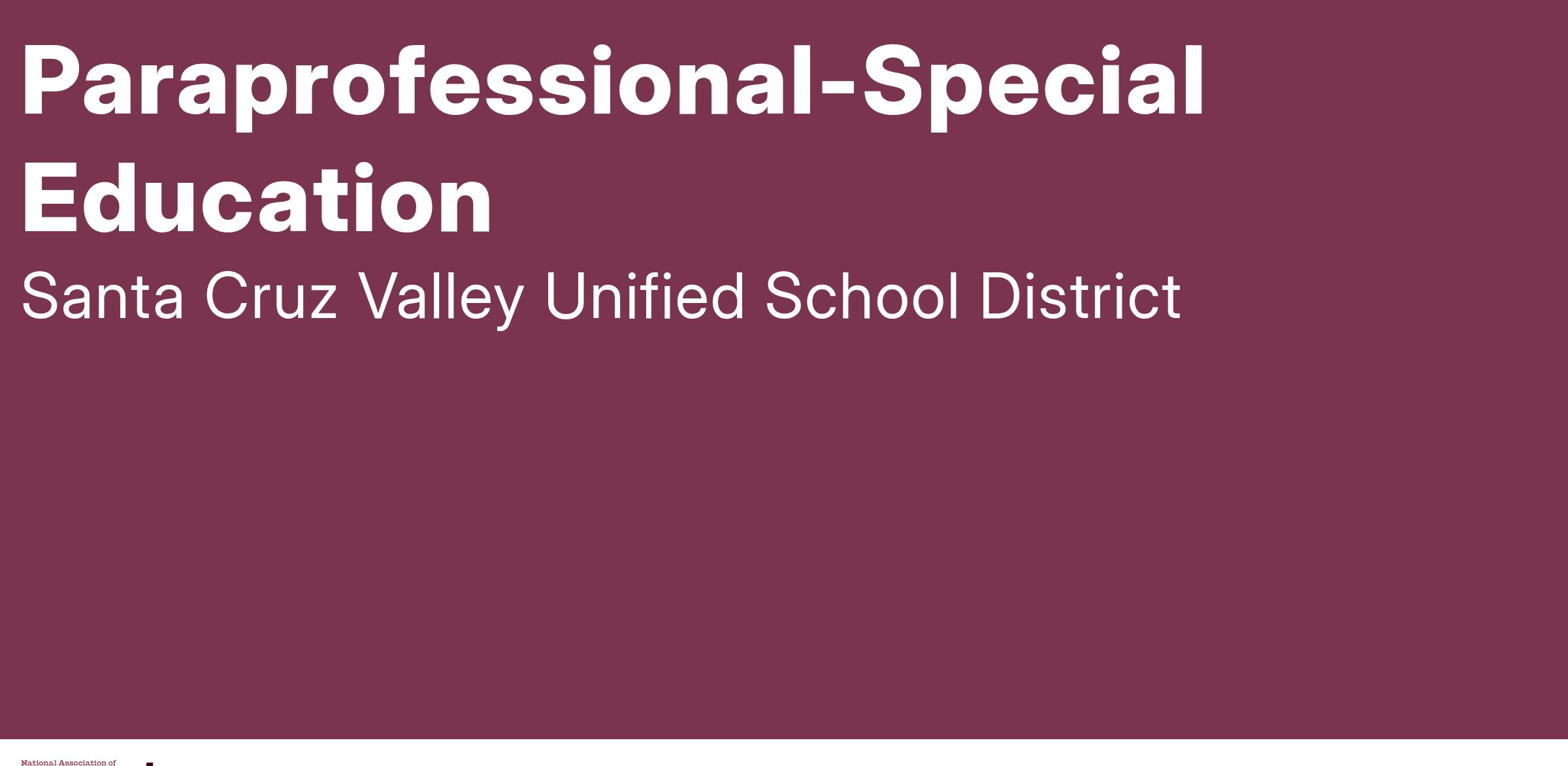 High school diploma or equivalent; AND Associate Degree OR minimum of sixty (60) credits post-secondary education OR passing score on a paraprofessional test; AND two (2) years of experience working with students with disabilities; OR an equivalent combination of education, training, and experience.