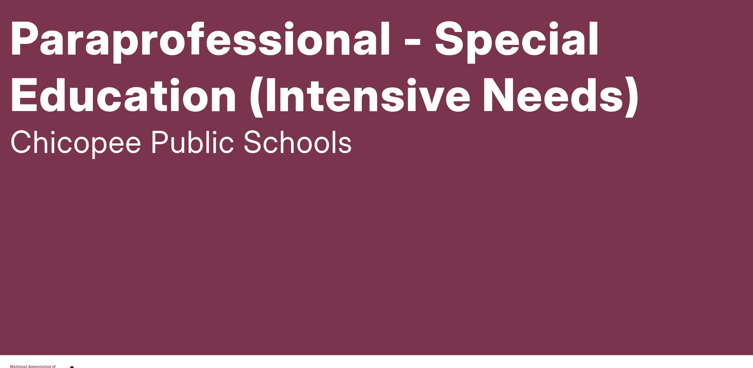 Must be trained or willing to be trained by the Chicopee Public schools in the knowledge and performance areas identified for the specific assignment (e.g., Implementation of a Student Behavior Plan, Use of Sign Basic Language, Use of a Communication Board, Physical Restraint and Verbal De-escalation Techniques).