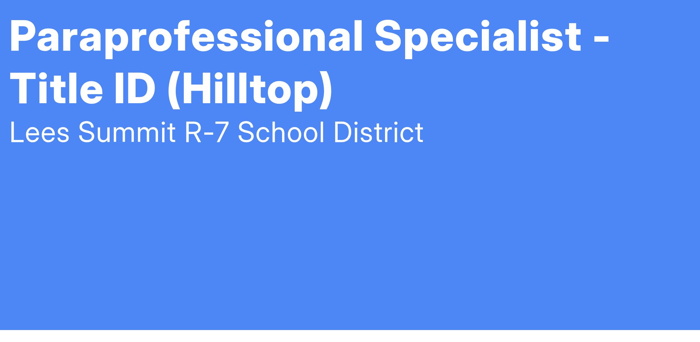 The job of Paraprofessional Specialist was established for the purpose/s of providing support to the instructional program within the assigned classroom with specific responsibility for working with at-risk students one-on-one; following educational and specific behavioral plans; documenting students’ daily activities, and modeling appropriate behaviors and interactions with student and staff.