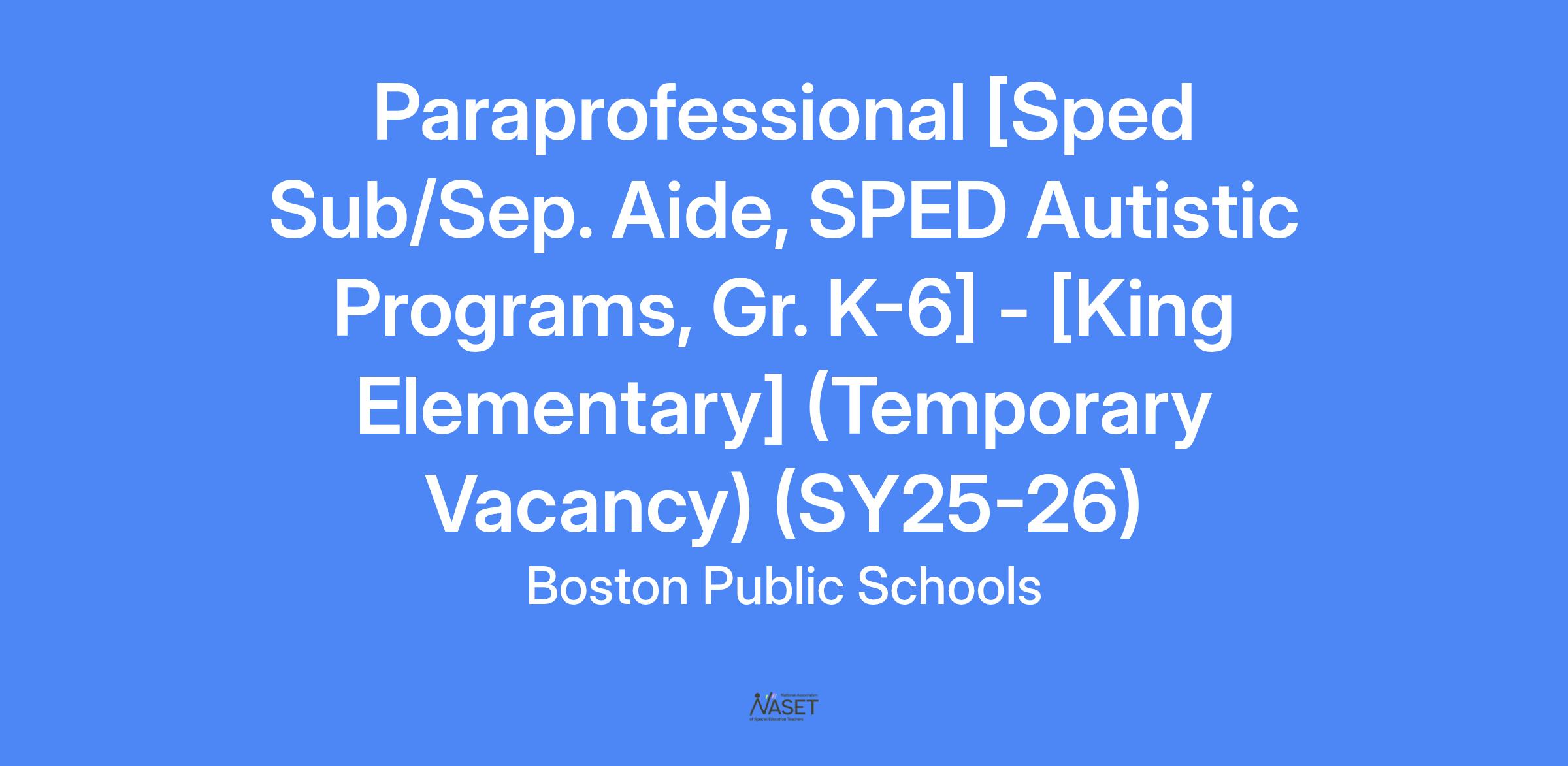 Paraprofessionals will assist teachers in providing an innovative, high quality education program designed to meet the needs of the children in the Boston Public Schools. Paraprofessionals will work with school staff to create an educational environment in which quality and continuity are key factors in educating the students of the Boston Public Schools.