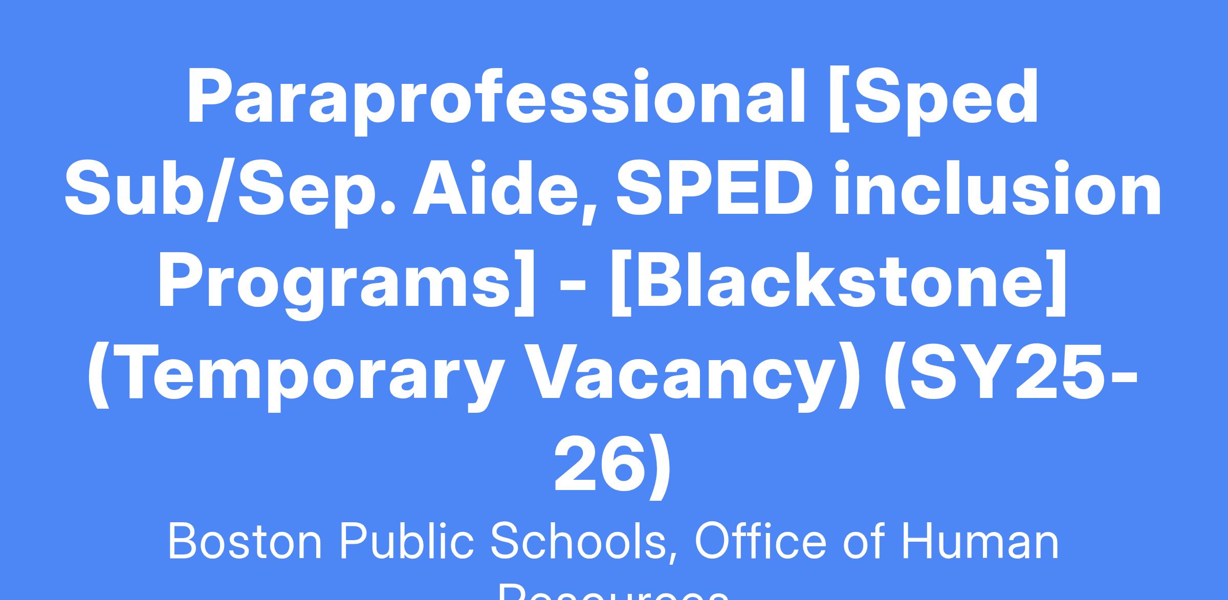 Paraprofessionals will assist teachers in providing an innovative, high quality education program designed to meet the needs of the children in the Boston Public Schools. Paraprofessionals will work with school staff to create an educational environment in which quality and continuity are key factors in educating the students of the Boston Public Schools.