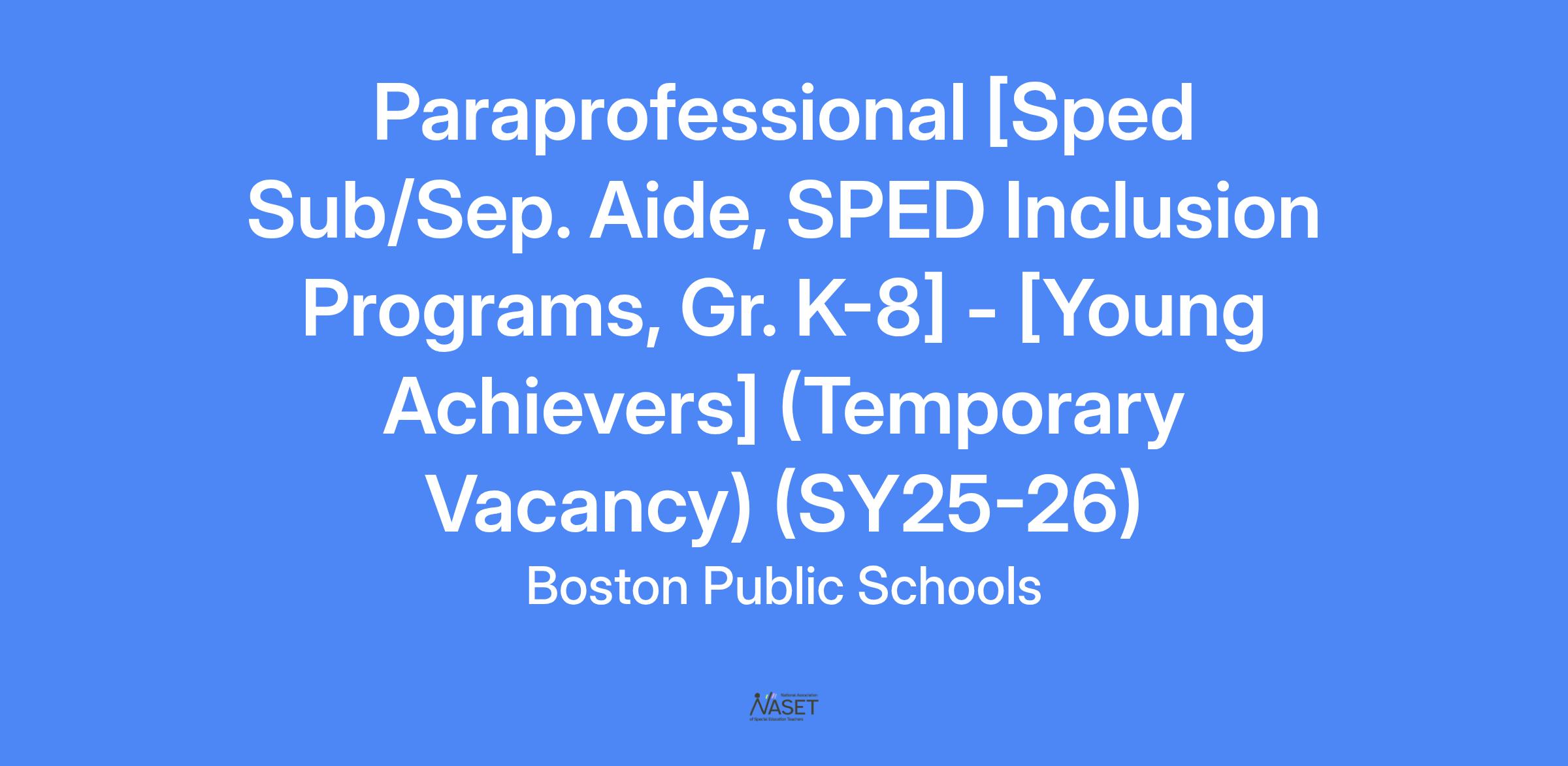 Paraprofessionals will assist teachers in providing an innovative, high quality education program designed to meet the needs of the children in the Boston Public Schools. Paraprofessionals will work with school staff to create an educational environment in which quality and continuity are key factors in educating the students of the Boston Public Schools.