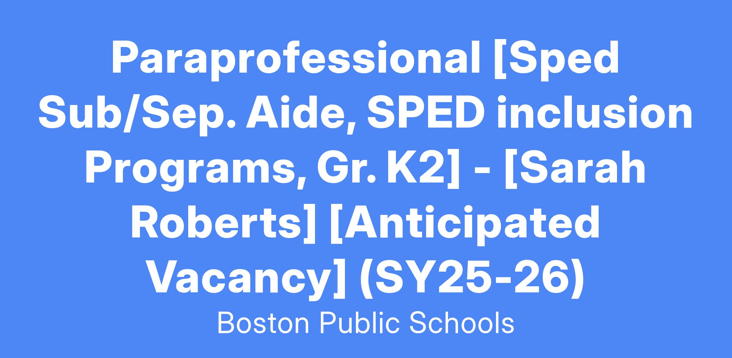 Paraprofessionals will assist teachers in providing an innovative, high quality education program designed to meet the needs of the children in the Boston Public Schools. Paraprofessionals will work with school staff to create an educational environment in which quality and continuity are key factors in educating the students of the Boston Public Schools.
