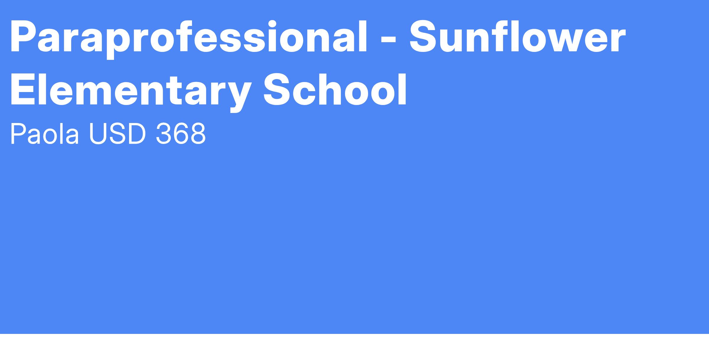 USD 368 is seeking applicants for special education paraprofessionals to work in general education classrooms at Sunflower Elementary School. This position serves 3rd through 5th grade, Special Education students in a general education classroom setting.