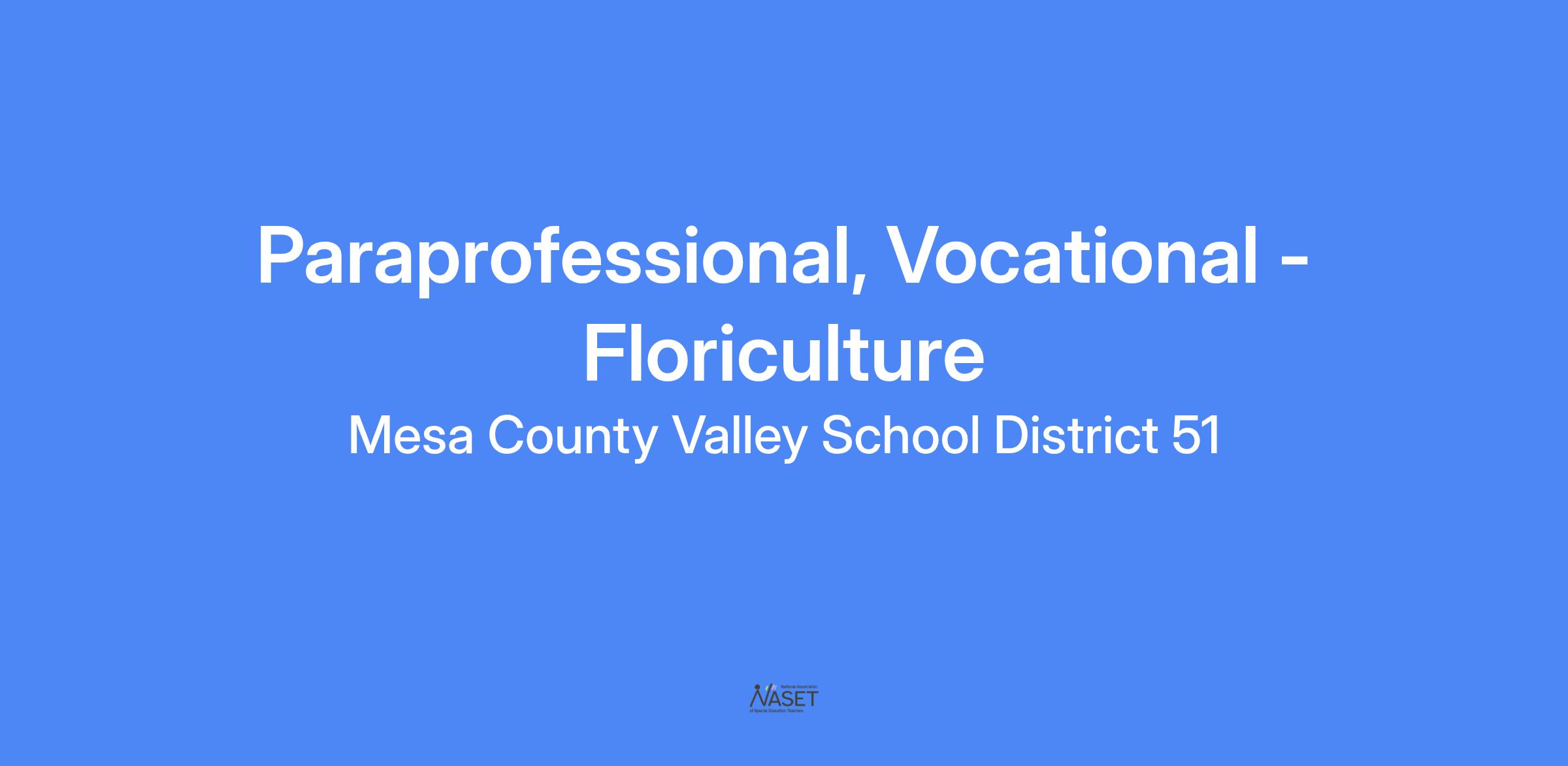 Job Title:Paraprofessional, Vocational - Floriculture Pay Program: Support Staff FLSA Status: Non-Exempt Reports to:Building Leader Pay Range: CH 6 $17.57 - $19.97 Work Year: Student Contact Days (175 Days / 6.5 Hours)