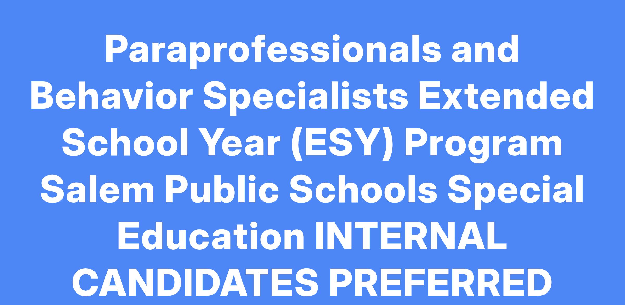 Paraprofessionals and Behavior Specialists Extended School Year (ESY) Program Salem Public Schools Special Education INTERNAL CANDIDATES PREFERRED
