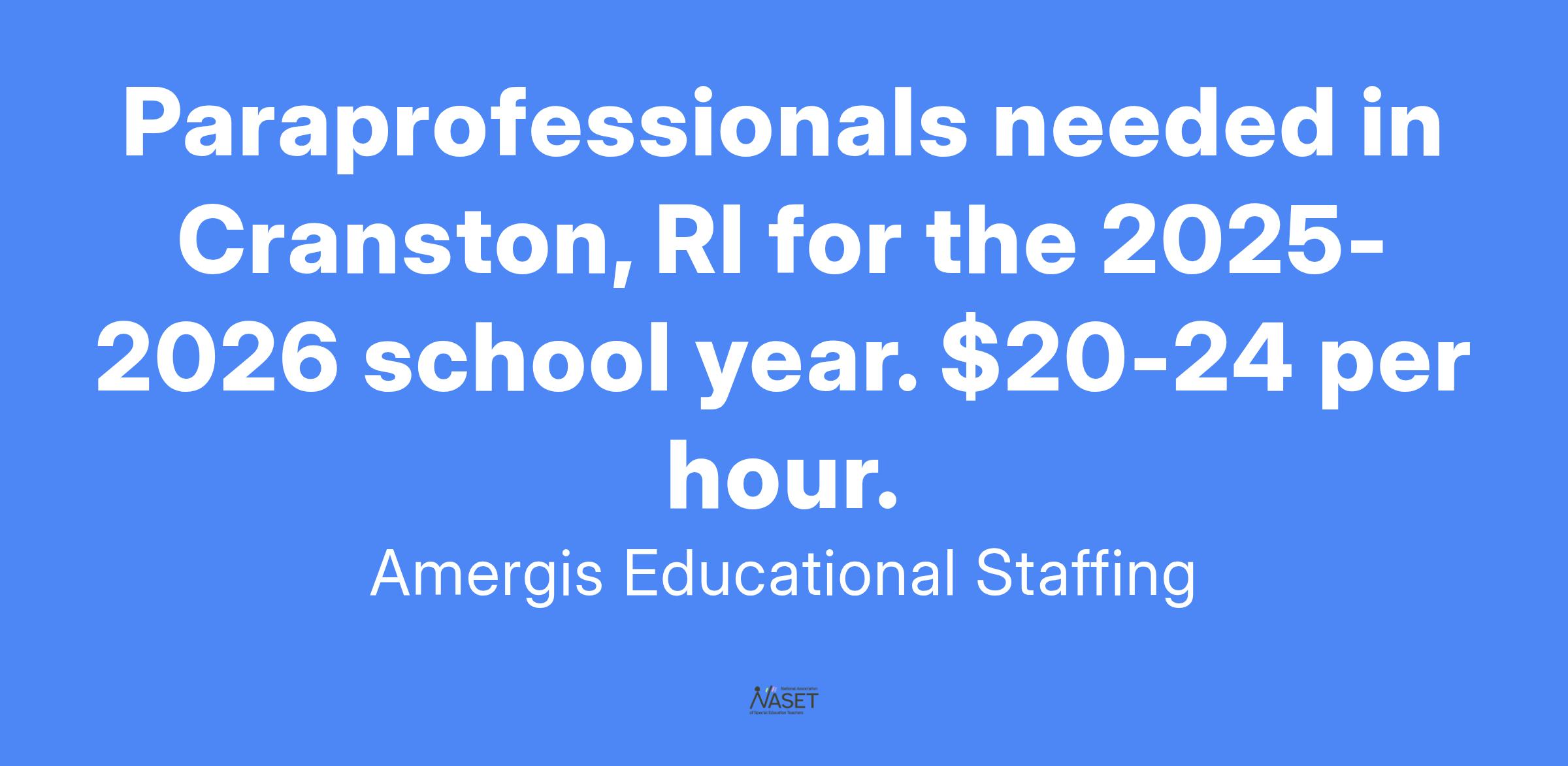 Amergis Staffing is partnered with a much respected school in Cranston, RI who are currently seeking Special Education Paraprofessionals to assist them on a contractual basis for the 2025-2026 school year.