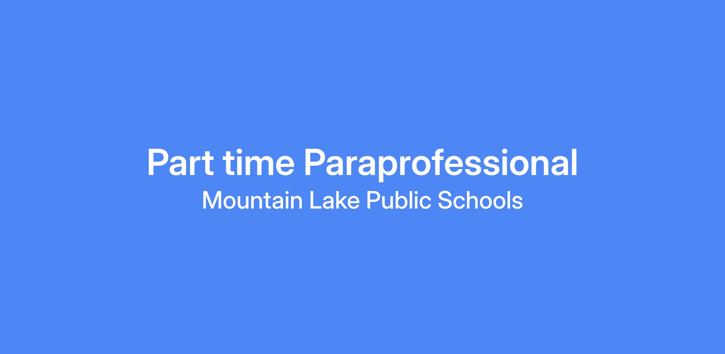 Mountain Lake Public School is seeking a (.4 FTE) Paraprofessional. Official duties will be determined.