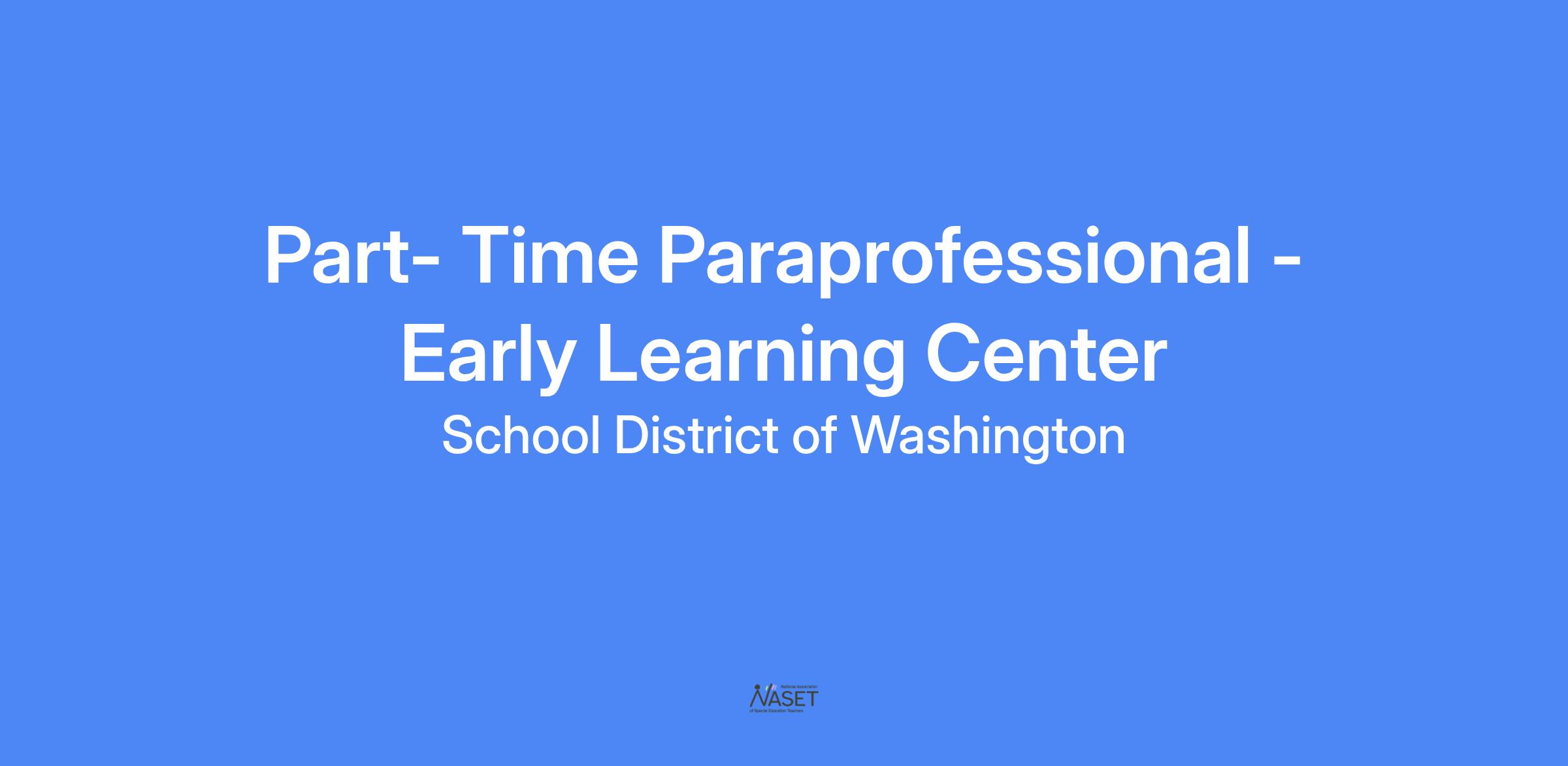 The School District of Washington is currently seekingPart-time Paraprofessional for the Early Learning Center for the 25/26 School Year. Starting pay ranges from $16.12 per hour up to $19.46 per hour, depending on experience. This job will be Monday - Friday half days. Inquiries should be directed to jennifer.meyer@sdowmo.org.