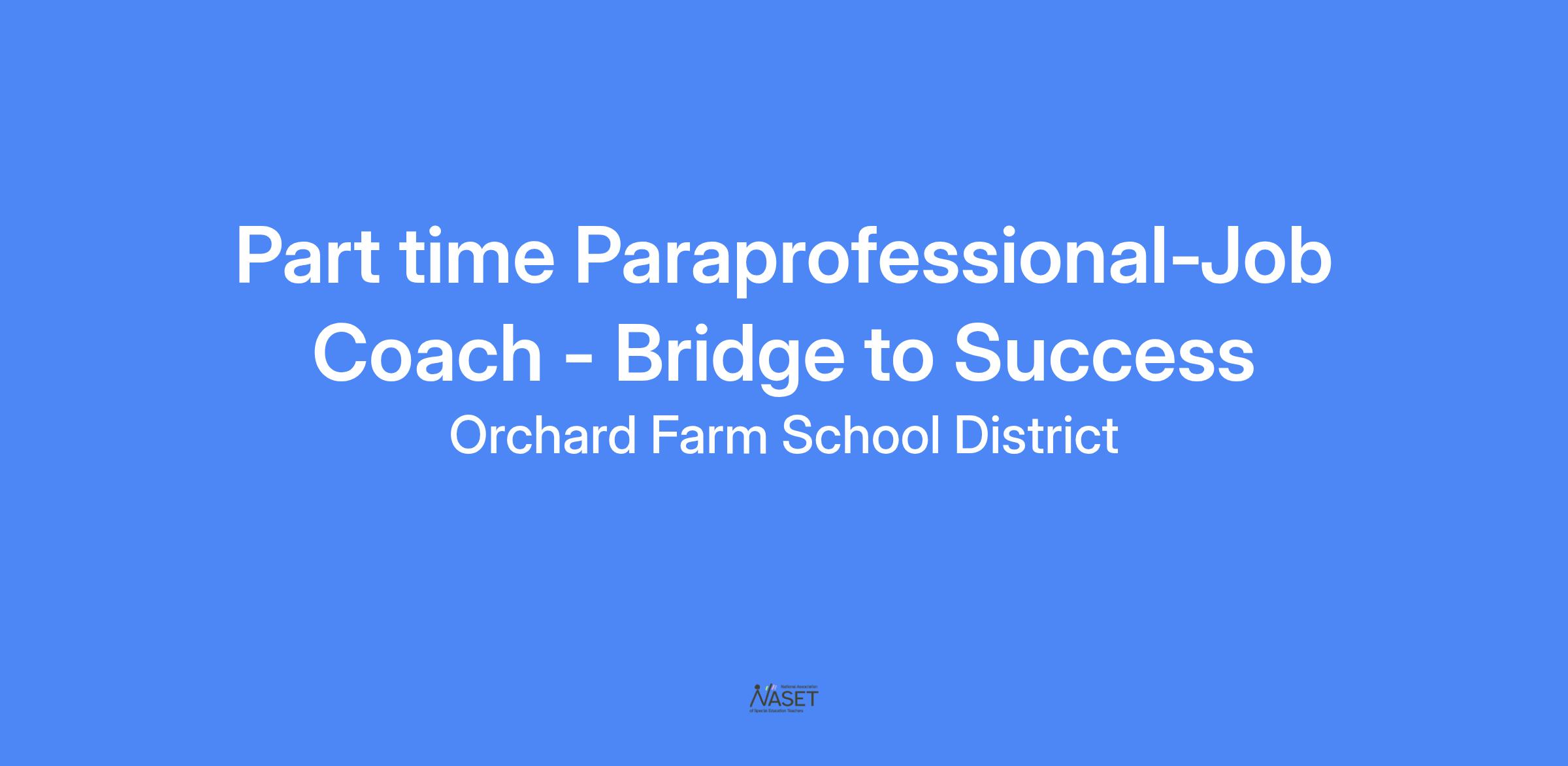 Orchard Farm School District is seeking a Part-time Paraprofessional to join our team at the Bridge to Success program for the remainder of the 2025-26 school year. The Paraprofessional will provide support to the instructional program with specific responsibilities for supporting work experience opportunities for special education students with community businesses and organizations; to develop pre-employment and employment skills; to provide information and/or direction to students.