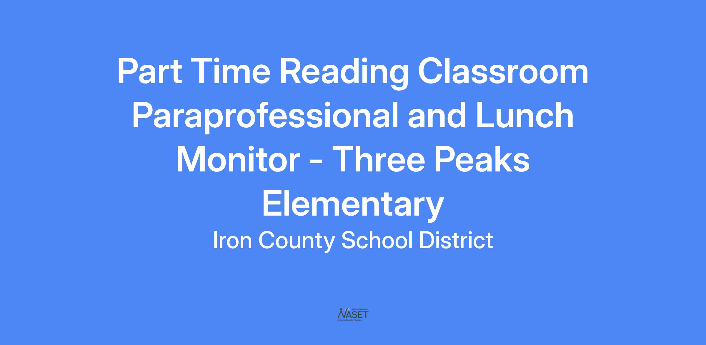 Three Peaks Elementary School is seeking a Part Time Reading Classroom Paraprofessional and Lunch Monitor to work 27.5 hours per week.