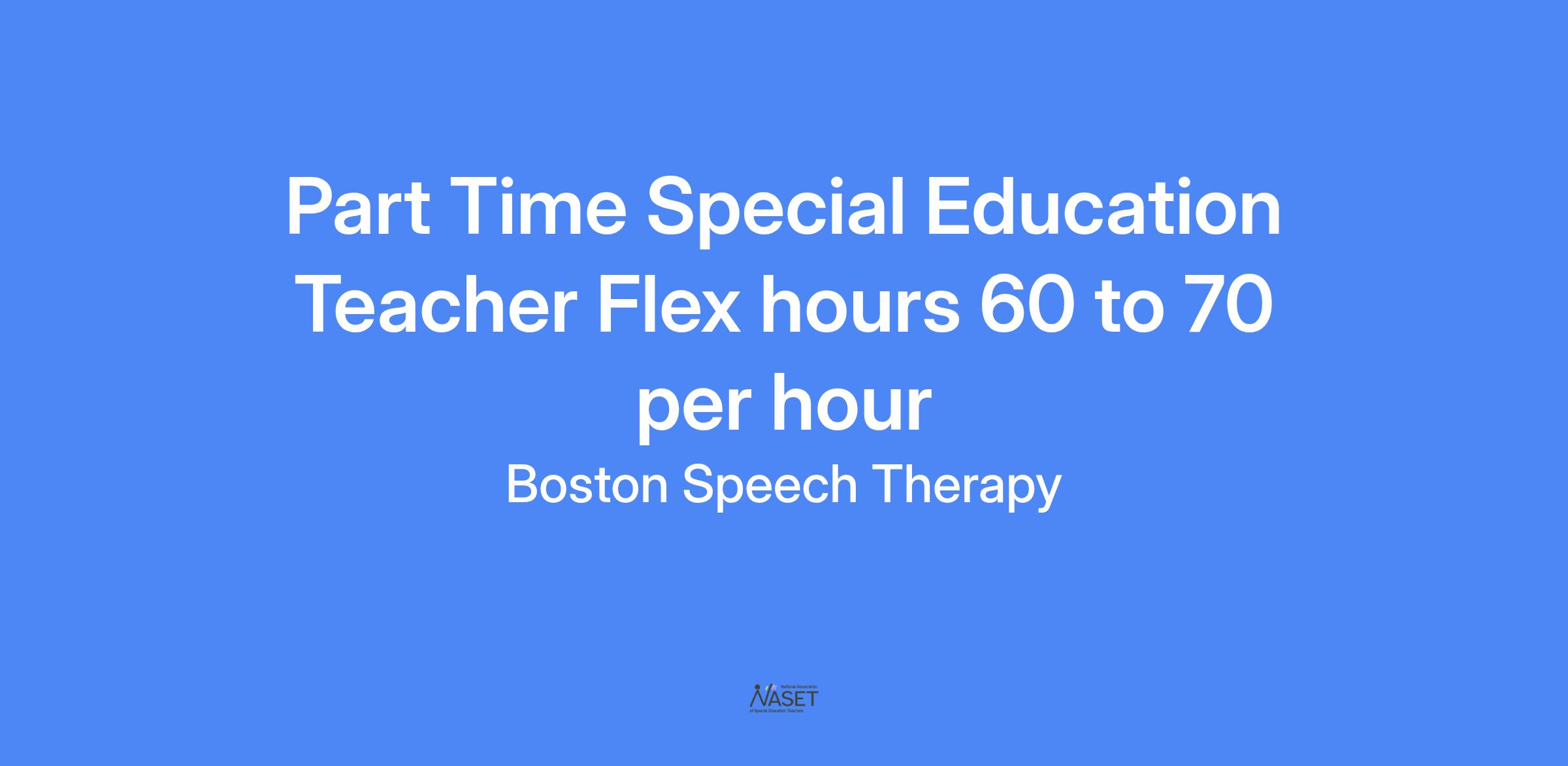 DescriptionBoston Speech Therapy is seeking a compassionate and dedicated Part Time Special Education Teacher to join our team. This role offers a flexible schedule and the opportunity to work with students who have diverse learning needs in an engaging and supportive environment.
