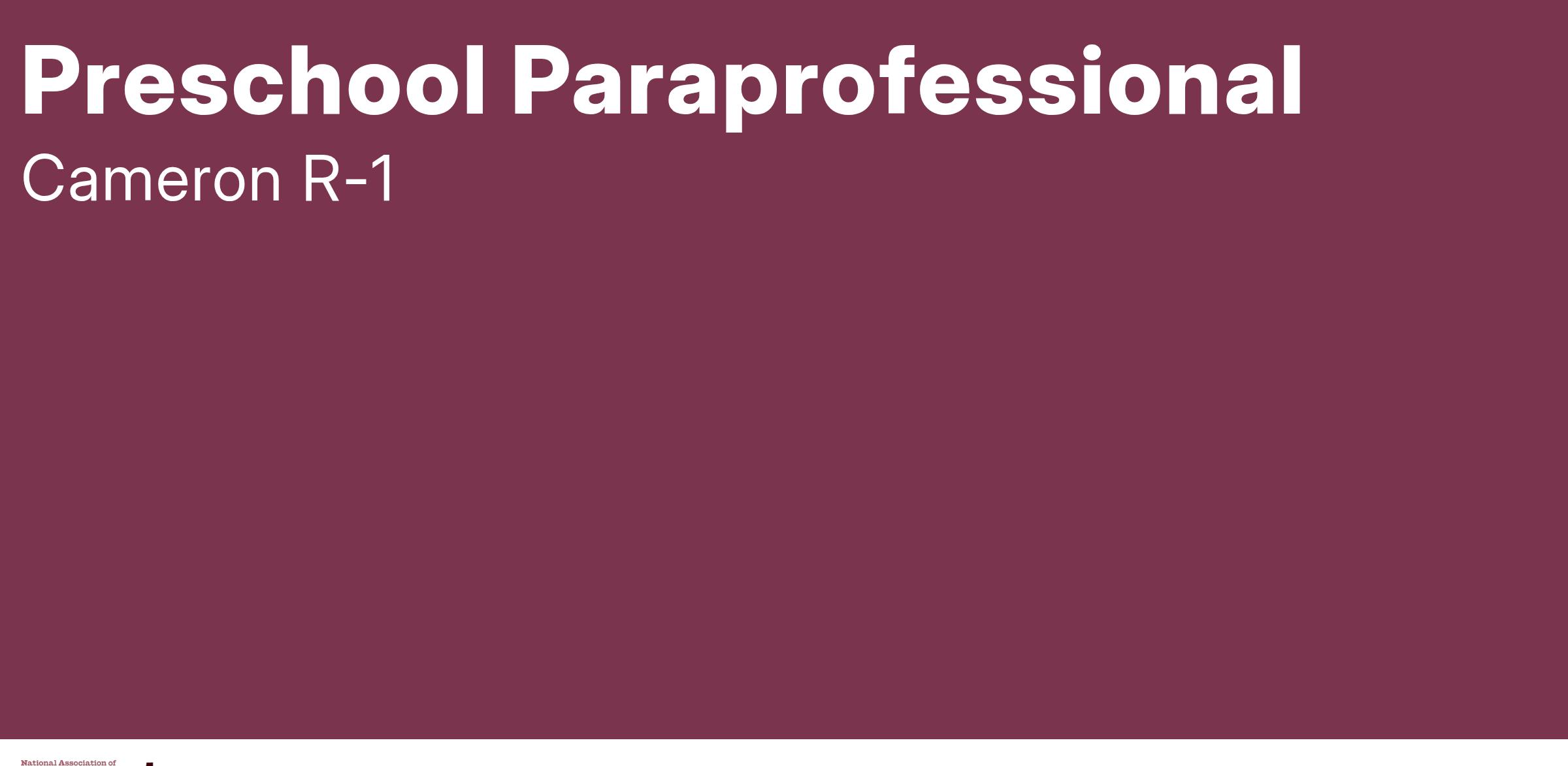 The Cameron R-I School District is accepting applications for a preschool paraprofessional for the 2025-2026 school year. Applicants should have 60 college hours and upload a copy of your transcripts with the application; or be willing to take and pass the MEGA assessment (Missouri Educator Gateway Assessment) for paraprofessionals or complete a required 20 hour substitute teacher training upon hire.
