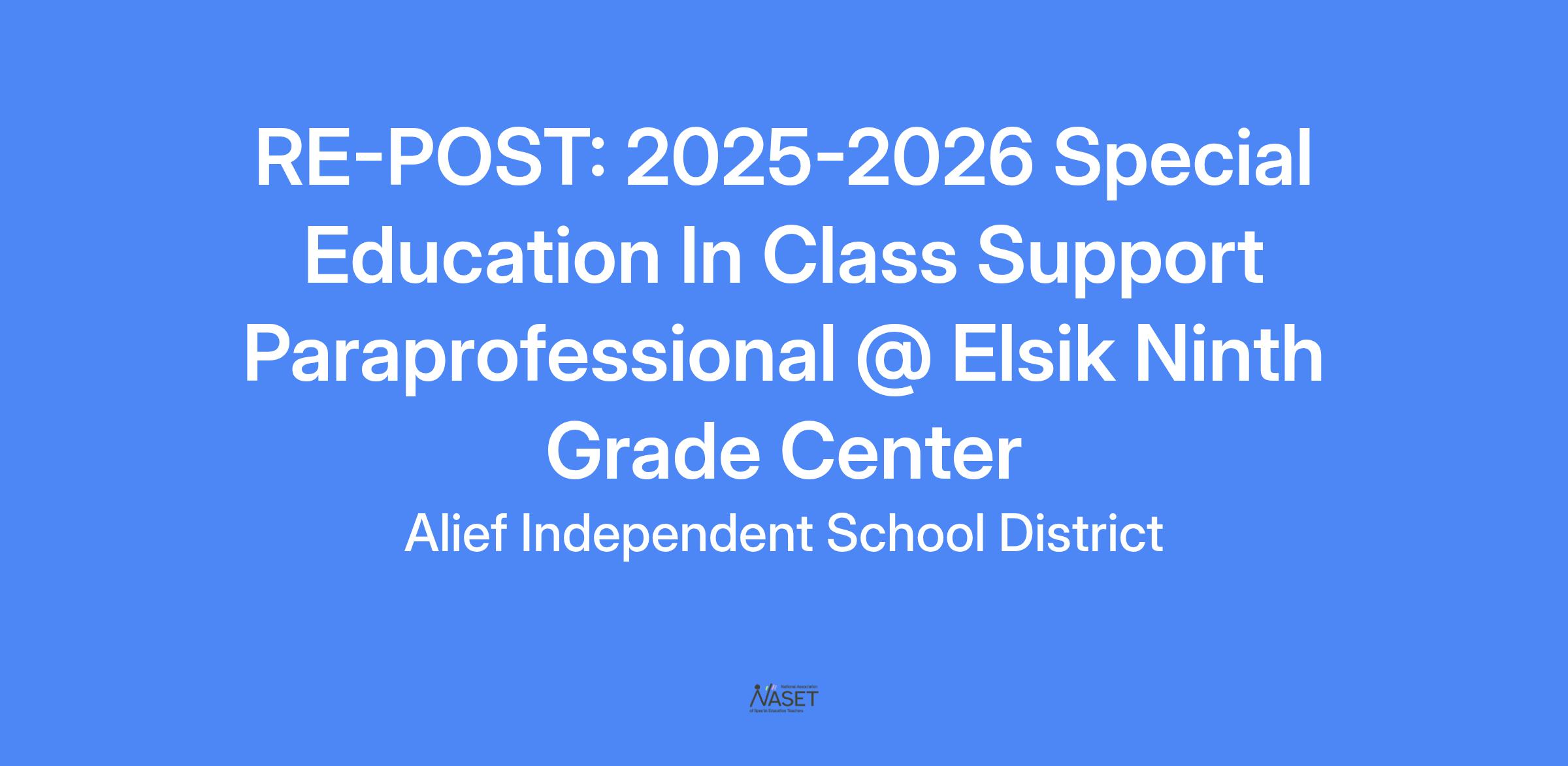 RE-POST: 2025-2026 Special Education In Class Support Paraprofessional @ Elsik Ninth Grade Center