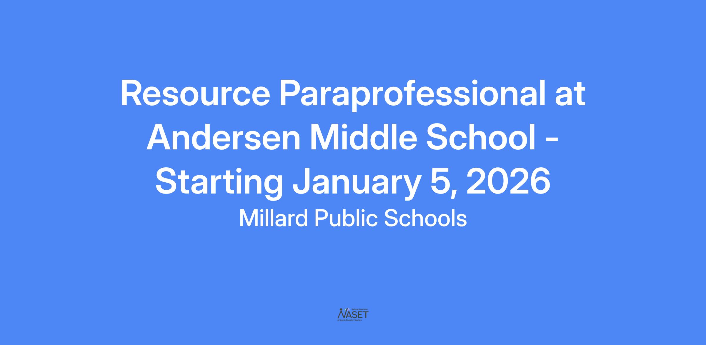 Andersen Middle School is seeking an energetic, positive, and student-centered Resource Paraprofessional to support our middle school students in the classroom. Hours are approximately 8:00-3:00 Monday through Friday, but we can be flexible! This position would start on January 5, 2026.