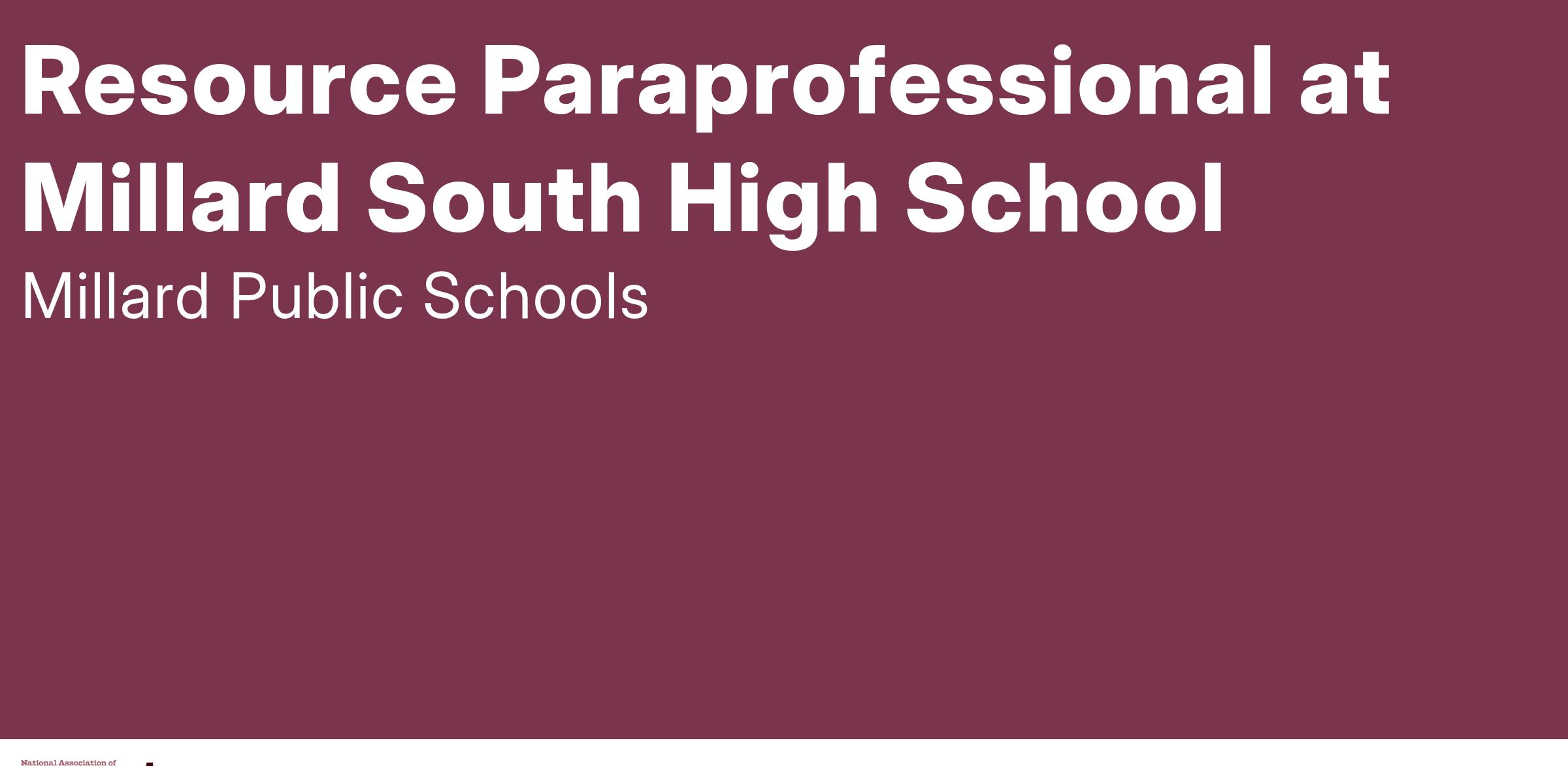 Millard South High School is seeking a resource paraprofessional for the 2025-26 school year. Hours are approximately 8 AM to 3 PM Monday-Friday.
