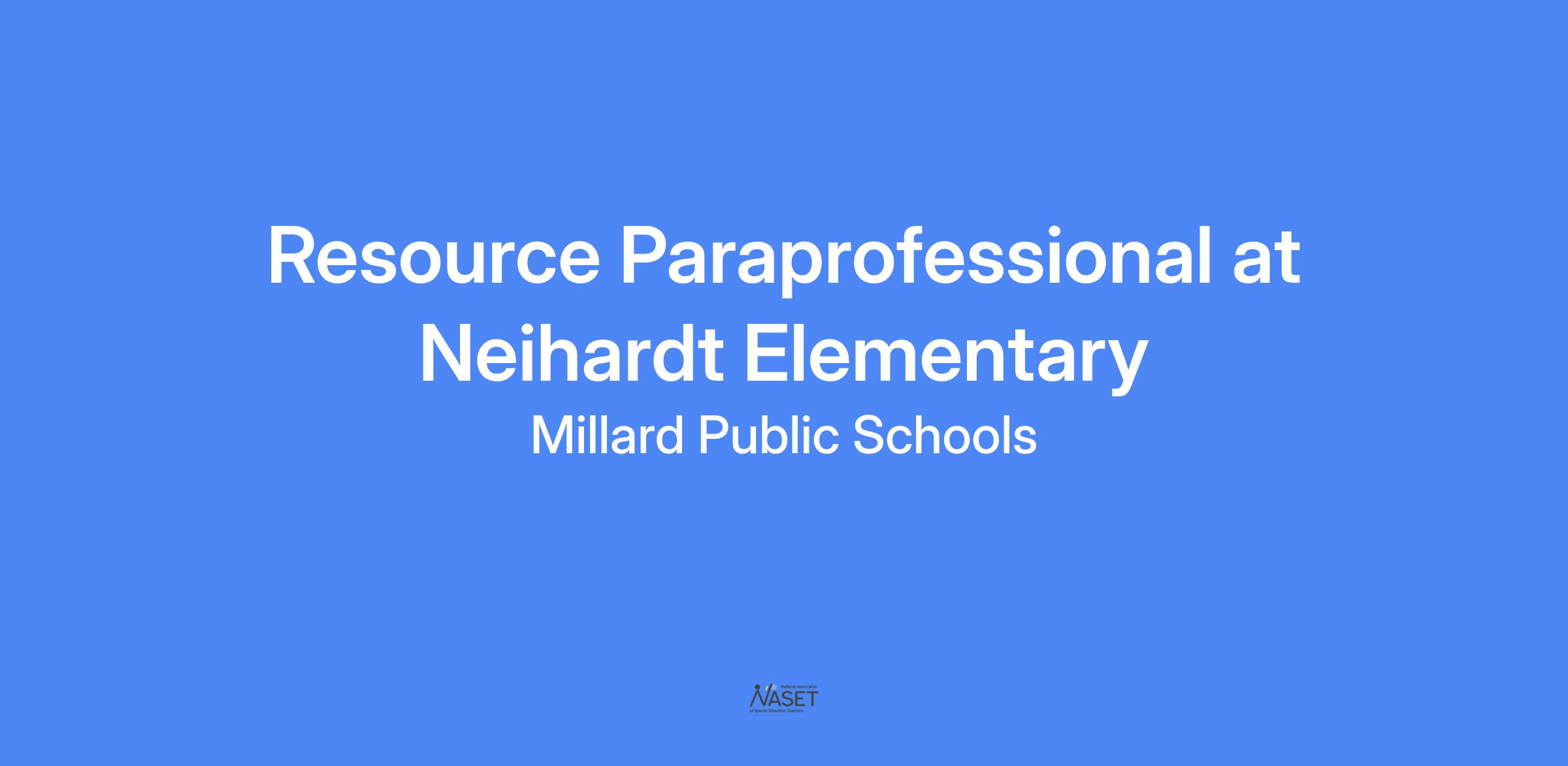Neihardt Elementary is seeking a highly motivated resource paraprofessional to support students in all content areas. Applicants should have experience with children and contribute to a positive work environment. This person will work with individual students and small groups on reading, writing, math and social skills throughout the day.