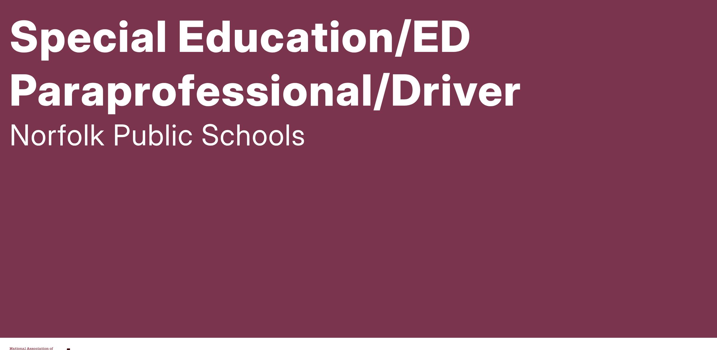 It is the policy of Norfolk Public Schools to not discriminate on the basis of sex, disability, race, color, religion, veteran status, national or ethnic origin, age, marital status, pregnancy, childbirth or related medical condition, or other protected status in its educational programs, admission policies, employment policies or other administered programs. Persons requiring accommodations to apply and/or be considered for positions are asked to make their request to the Superintendent.