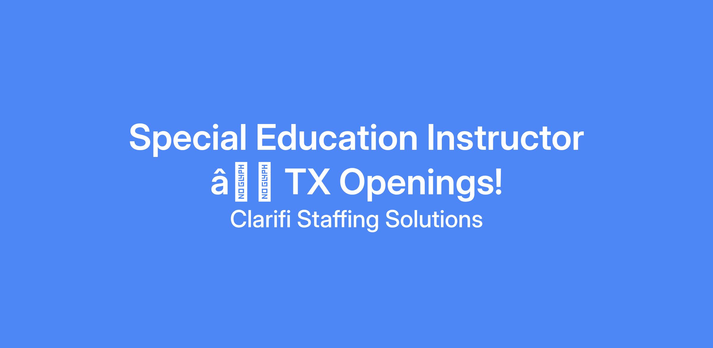 <\/html>"}}],"isMobile":false,"iframe":"true","jobType":"Full time","applyName":"Apply Now","zsoid":"654270757","FontFamily":"PuviRegular","jobOtherDetails":[{"fieldLabel":"Industry","uitype":2,"value":"Education"},{"fieldLabel":"City","uitype":1,"value":"Dallas"},{"fieldLabel":"State\/Province","uitype":1,"value":"Texas"},{"fieldLabel":"Zip\/Postal Code","uitype":1,"value":"75205"}],"headerName":"Special Education Instructor â TX Openings!","widgetId":"422351000000072311","isJobBoard":"false","userId":"422351000000185003","attachArr":[],"customTemplate":"5","isCandidateLoginEnabled":true,"jobId":"422351000007945731","FontSize":"15","googleIndexUrl":"https:\/\/clarifistaffing.zohorecruit.com\/recruit\/ViewJob.na?digest=qqSu.seyv.cGNMTtc1PT5cLZt6UGhFJS9cq7IiUZgRk\-&embedsource=Google","location":"Dallas","embedsource":"CareerSite","indeedCallBackUrl":"https:\/\/recruit.zoho.com\/recruit\/JBApplyAuth.do","logoId":"3yyte2e34eb453c1341c6afb99f3b29fd7e58"}