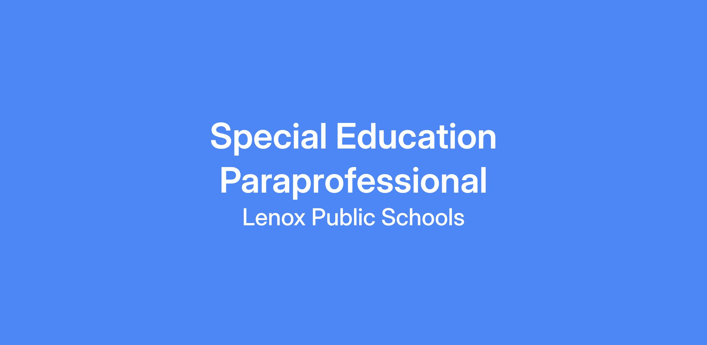 INFORMATION: The Lenox Public Schools is seeking a dedicated Special Education Paraprofessional to work in a variety of settings. This position will focus primarily on providing one-to-one support for two specific students with special needs.