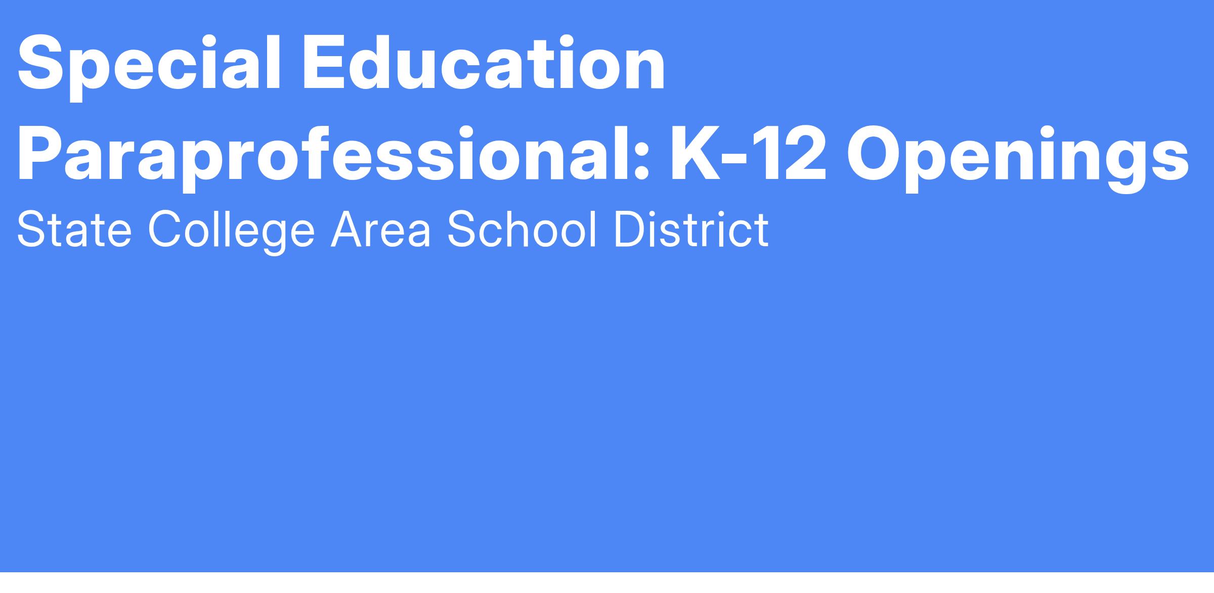 The State College Area School District is currently seeking energetic, collaborative, child-centered individuals for Interventionist Paraprofessional positions for the Special Education Department. These are district-wide positions with an initial assignment that will be discussed during the interview.