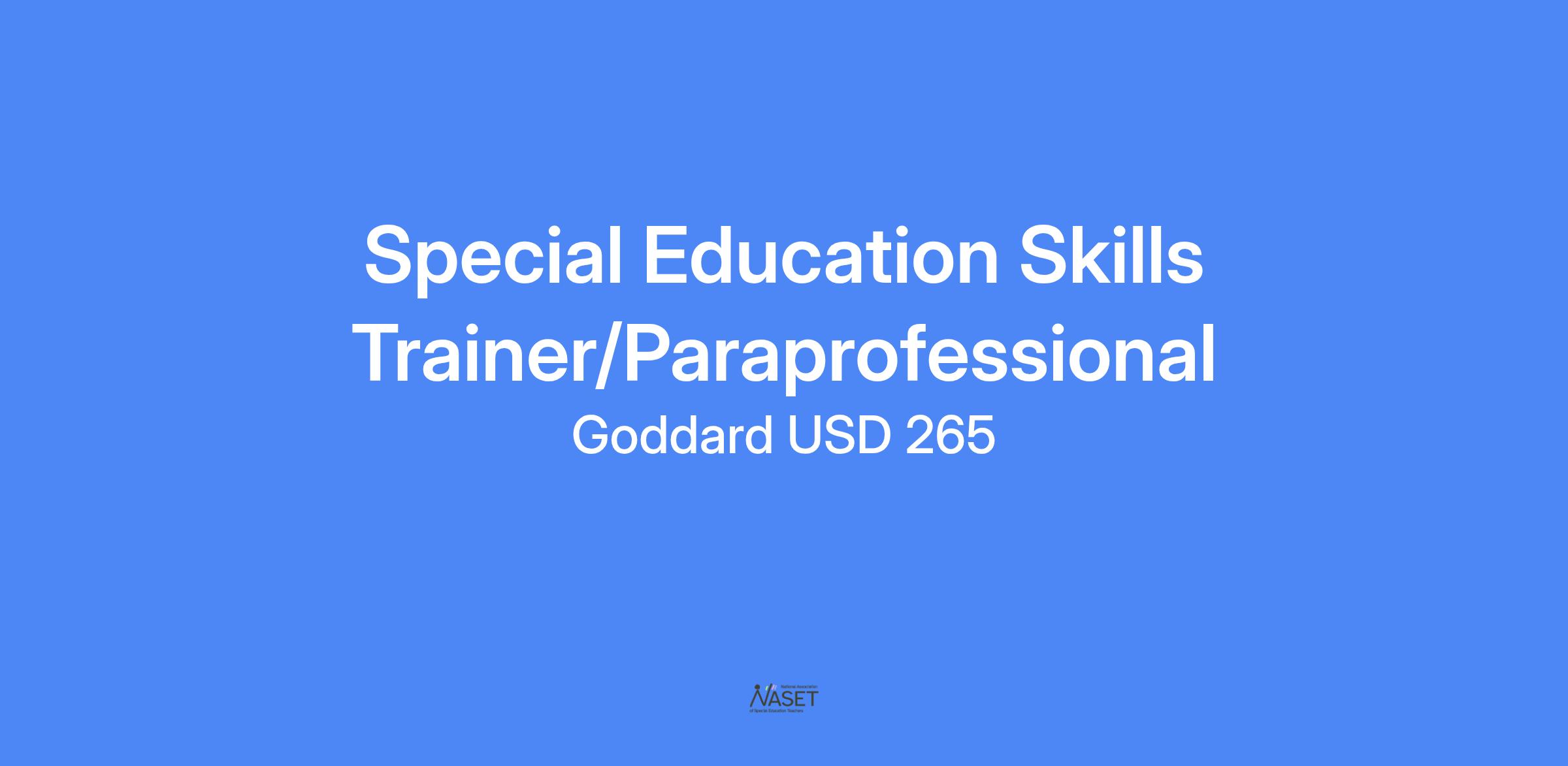 Special Education Skills Trainer/Paraprofessional @ T.I.E.S. (10 month position, 35 hours per week): The Goddard Special Education Cooperative is hiring Special Education Skills Trainers for the 2024-2025 school year. Our Skills Trainers encourage independent work skills, teach job tasks/skills, and/or assess individual work strengths and weaknesses to assist with soft skills and relationship development with coworkers/managers and program staff. The Skills Trainers will be assigned to T.I.E.S. (Transition to Independence, Employment, and Success) which is based out of our Eisenhower Campus. Please direct questions regarding this position to Melody Stuckey (mstuckey@goddardusd.com). Positions open until filled.