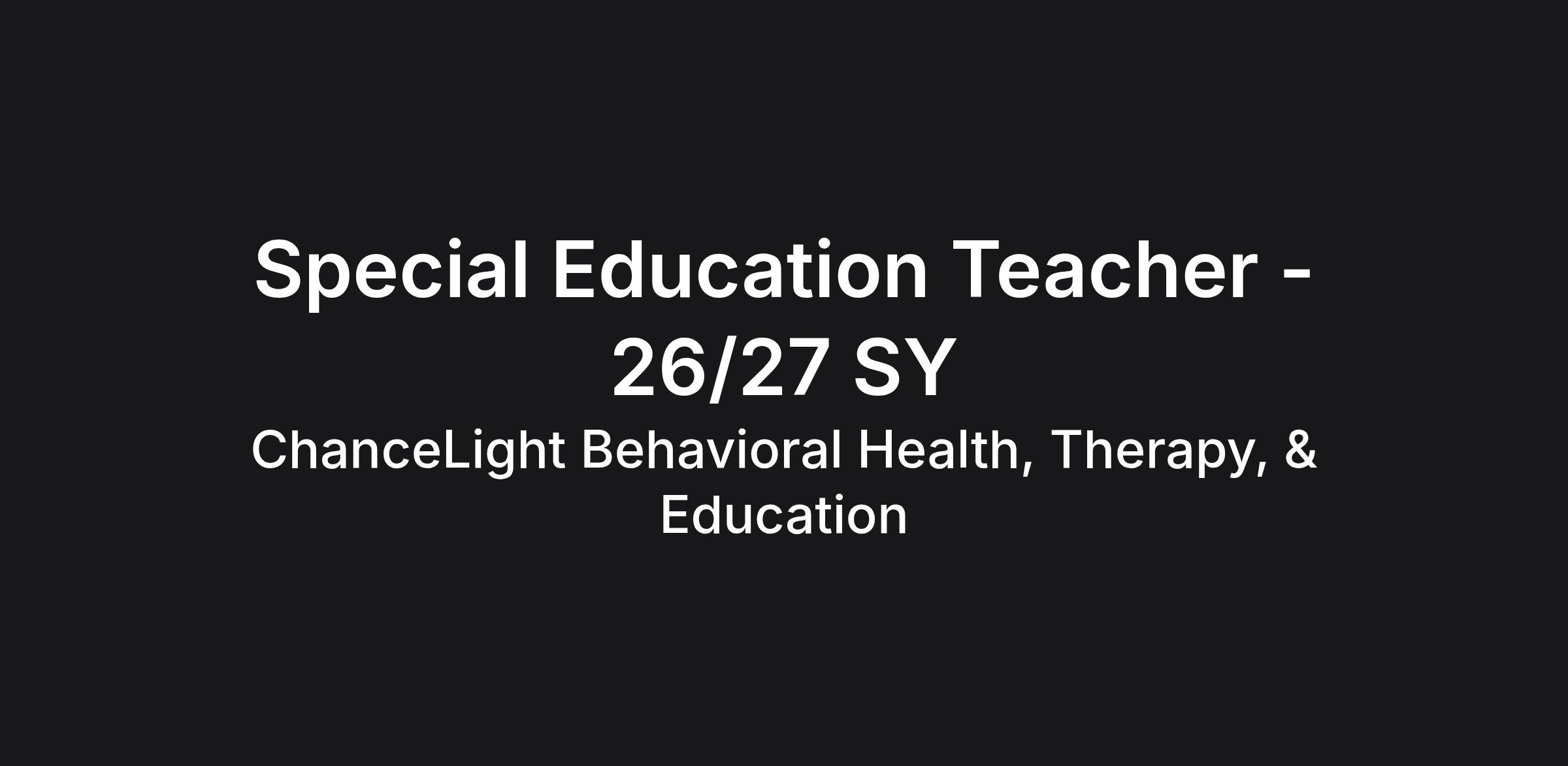ChanceLight Behavioral Health, Therapy, & Education, a growing, dynamic organization with a social mission to offer hope, is seeking a Special Education Teacher to join our award-winning team for the 2026-2027 School Year and perform meaningful work in a culture that welcomes innovation, encourages creative expression and offers limitless potential for personal and professional satisfaction!