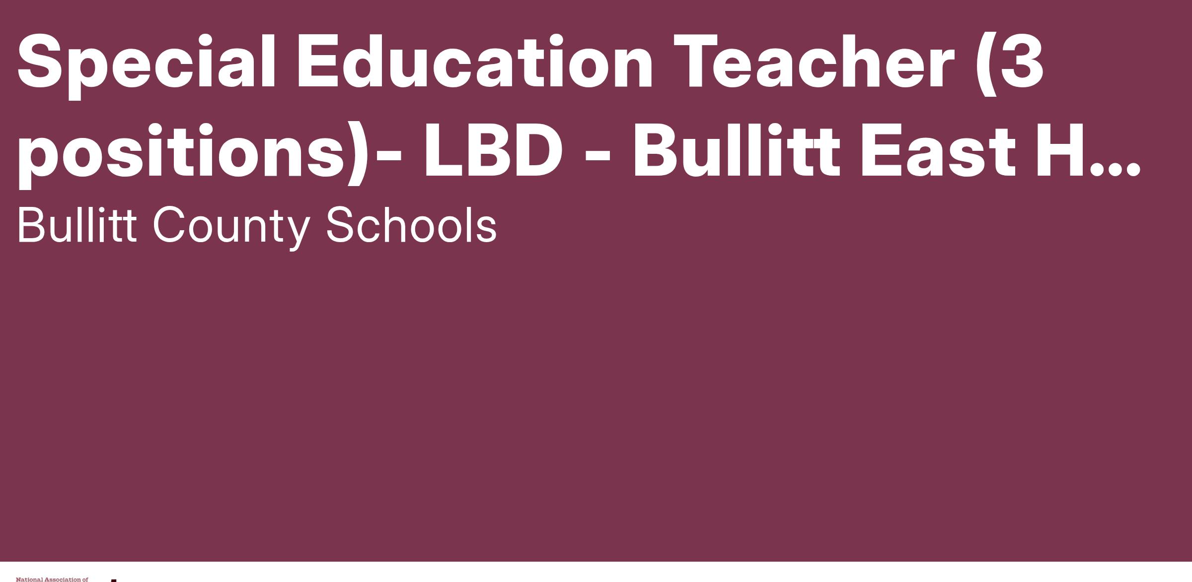 Due to student population growth, Bullitt East High School is looking for three motivated Special Education Teachers. Candidates should hold certification for teaching students with Learning and Behavior Disorders (LBD). This individual will be responsible for planning, organizing and delivering a program of instruction that supports the premise that high expectations for all students are possible, also implements activities that assist students reaching mastery under Big Arrow #1: Improving Student Achievement, and is committed to our school mission "College. Career. Tradition. Unrivaled." Applicants should expect to work in an atmosphere of collegiality and should be willing to support our students through some extra-curricular or co-curricular program.