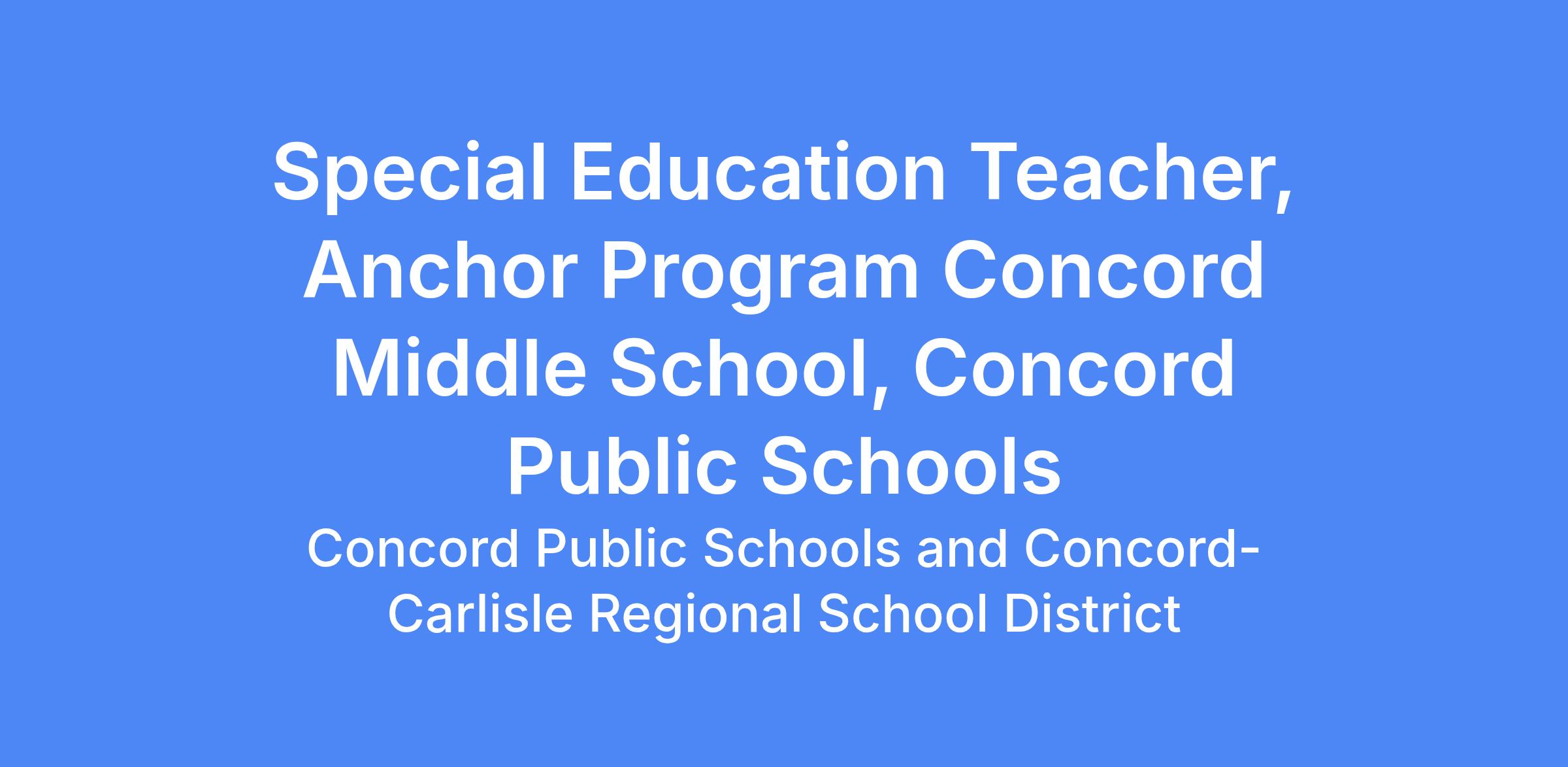Concord Middle School is seeking a skilled and compassionate Special Education Teacher to join the Anchor Program, a substantially separate therapeutic program for middle school students with emotional disabilities and related social, emotional, behavioral, and mental health needs.